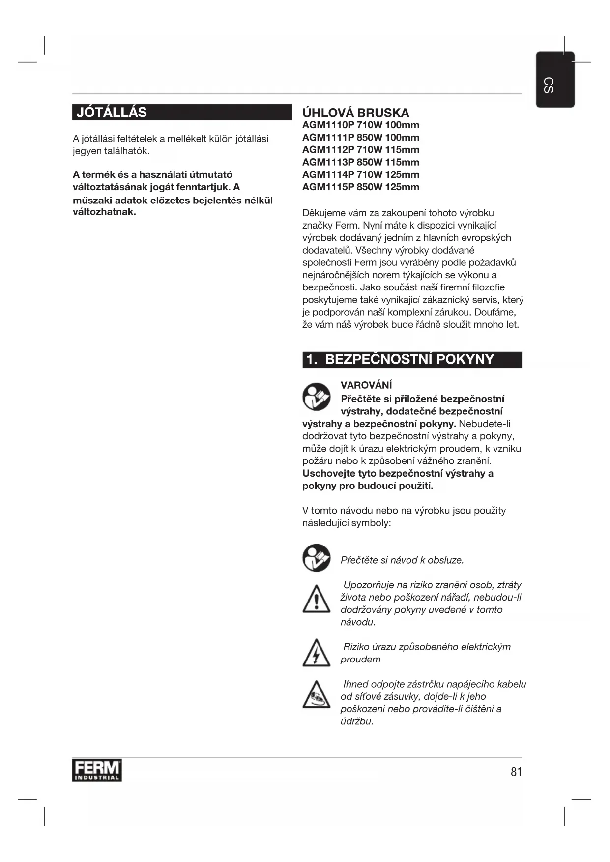 A jótállási feltételek a mellékelt külön jótállási jegyen találhatók. A termék és a használati útmutató változtatásának jogát fenntartjuk. A műszaki adatok előzetes bejelentés nélkül változhatnak. ÚHLOVÁ BRUSKA AGM1110P 710W 100mm AGM1111P 850W 100mm AGM1112P 710W 115mm AGM1113P 850W 115mm AGM1114P 710W 125mm AGM1115P 850W 125mm Děkujeme vám za zakoupení tohoto výrobku značky Ferm. Nyní máte k dispozici vynikající výrobek dodávaný jedním z hlavních evropských dodavatelů. Všechny výrobky dodávané společností Ferm jsou vyráběny podle požadavků nejnáročnějších norem týkajících se výkonu a bezpečnosti. Jako součást naší firemní filozofie poskytujeme také vynikající zákaznický servis, který je podporován naší komplexní zárukou. Doufáme, že vám náš výrobek bude řádně sloužit mnoho let.