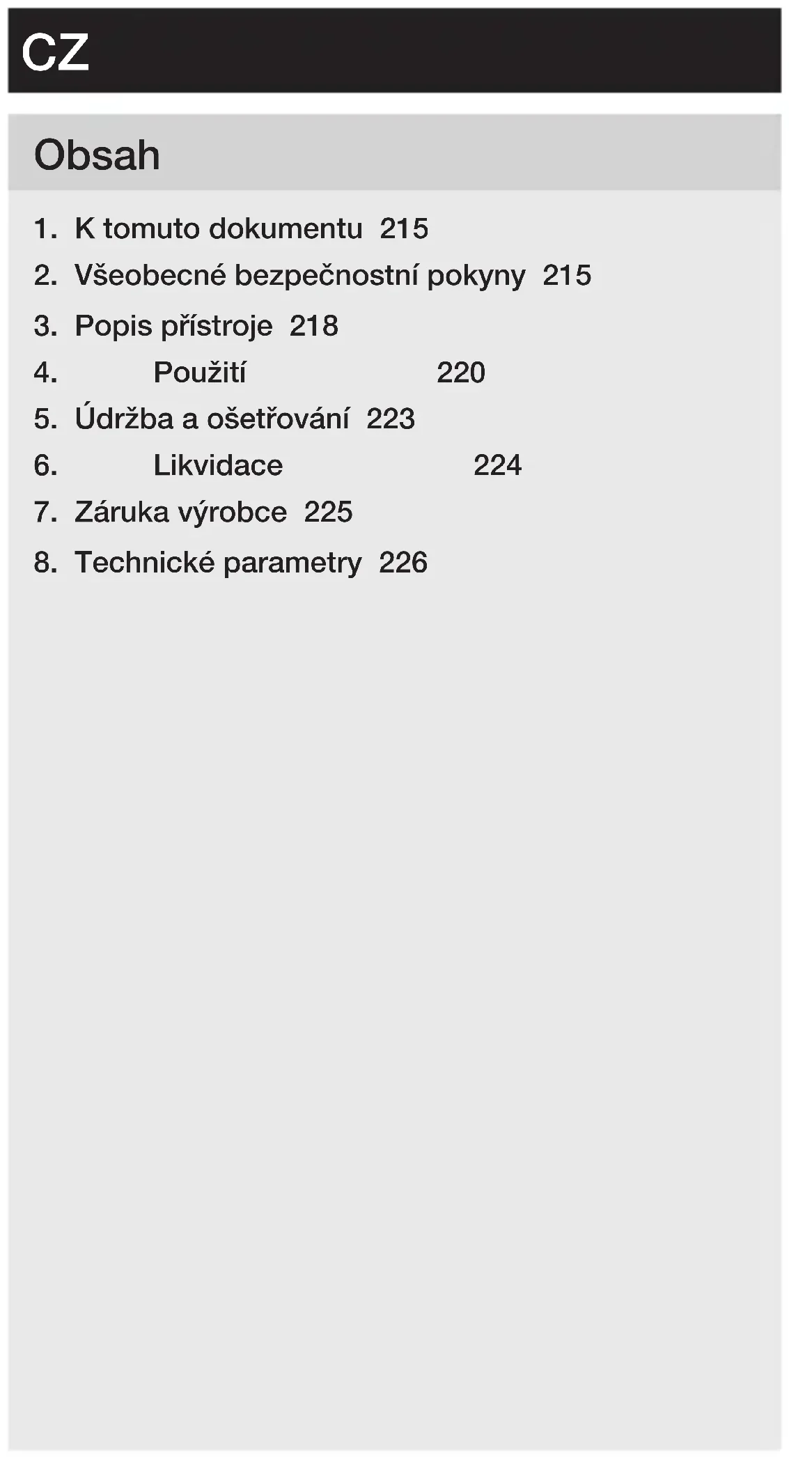 Elektrické přístroje, příslušenství a obaly musí být odvezeny kekologickému opětovnému zhodnocení. Nevyhazujte elektrické přístroje do domovní- ho odpadu, ohně nebo vody! Jen pro země EU: Vsouladu splatnou evropskou směrnicí oodpadních elek- trických a elektronických zařízeních a jejím převedení do národního práva musí být nepoužitelná elektrická zařízení separována aodevzdána kekologickému opětovnému zhodnocení.CZ – 225 –ObsahPodle směrnice RL 2006/66/ES musí být vadné nebo opotřebované akumulátory recyklovány. Nepoužitelné akumulátory můžete odevzdat vprodejně nebo ve sběrně nebezpečných odpadů.