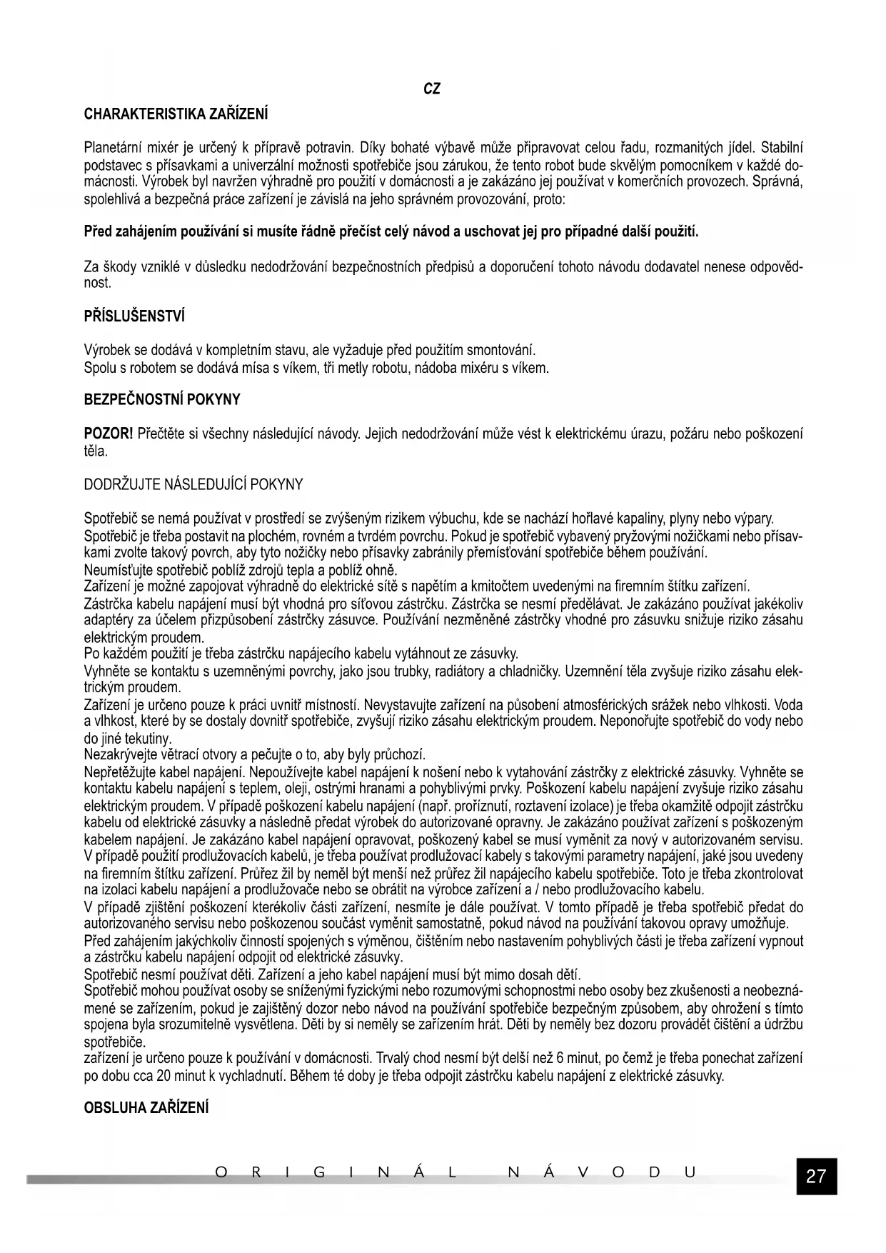 Planetární mixér je určený k přípravě potravin. Díky bohaté výbavě může připravovat celou řadu, rozmanitých jídel. Stabilní podstavec s přísavkami a univerzální možnosti spotřebiče jsou zárukou, že tento robot bude skvělým pomocníkem v každé do- mácnosti. Výrobek byl navržen výhradně pro použití v domácnosti a je zakázáno jej používat v komerčních provozech. Správná, spolehlivá a bezpečná práce zařízení je závislá na jeho správném provozování, proto: Před zahájením používání si musíte řádně přečíst celý návod a uschovat jej pro případné další použití. Za škody vzniklé v důsledku nedodržování bezpečnostních předpisů a doporučení tohoto návodu dodavatel nenese odpověd- nost.