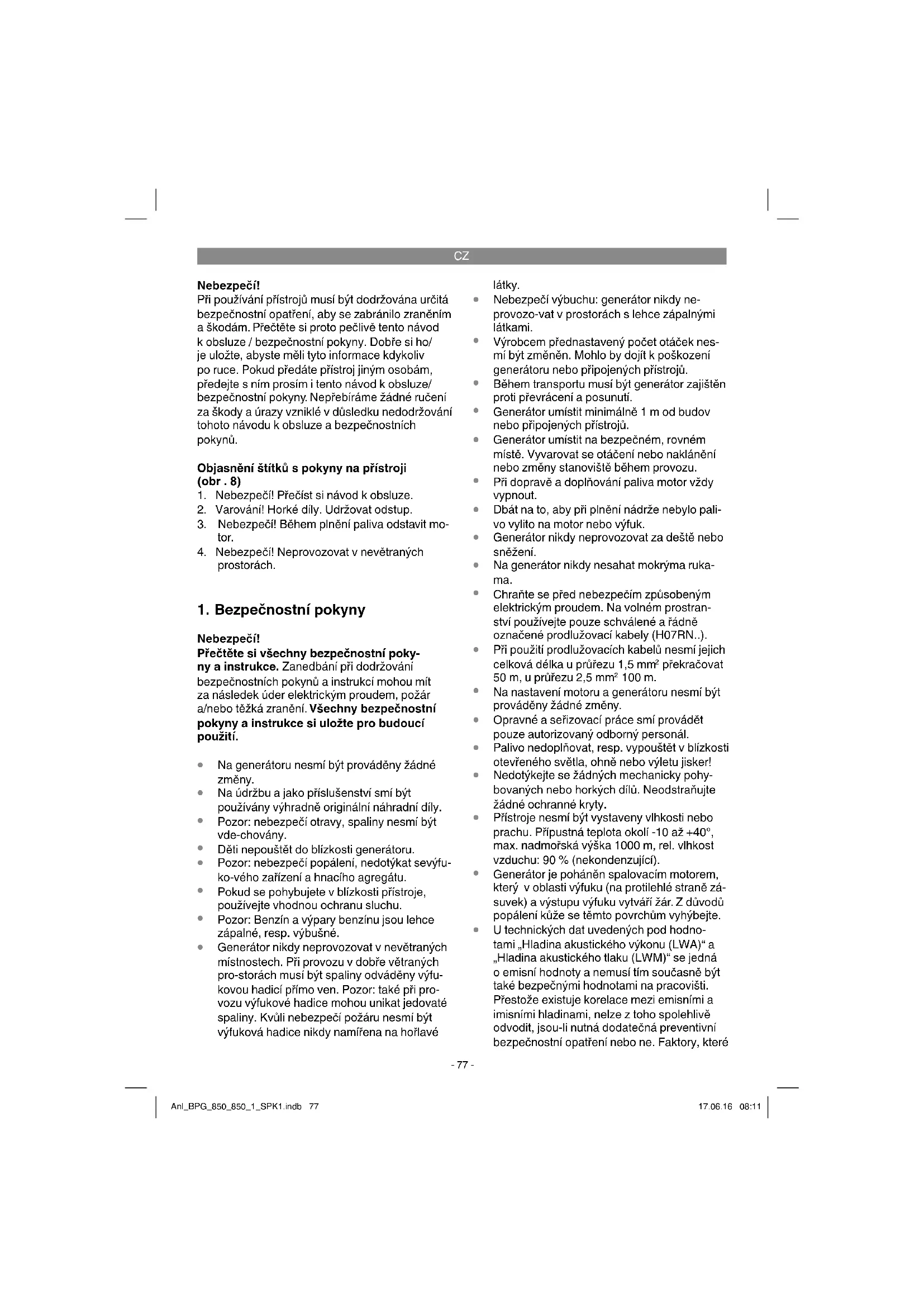 P řístroj je vhodný pro všechna použití vyžadující provoz na 230 V zdroji střídavého napětí. Bezpodmínečně dodržujte omezení v bezpečnostních pokynech. Účelem generátoru je pohon elektrického nářadí a zásobování zdrojů světla elektrickým proudem. U domácích spotřebičů zkontrolujte prosím podle údajů výrobce jejich vhodnost. V případě nejasností se prosím obraťte na autorizovaného prodejce. Přístroj smí být používán pouze podle svého účelu určení. Každé další, toto překračující použití, neodpovídá použití podle účelu určení. Za z toho vyplývající škody nebo zranění všeho dru- hu ručí uživatel/obsluhující osoba a ne výrobce. Dbejte prosím na to, že naše přístroje nebyly podle svého účelu určení konstruovány pro živnostenské, řemeslnické nebo průmyslové použití. Nepřebíráme proto žádné ručení, pokud je přístroj používán v živnostenských, řemeslných nebo průmyslových podnicích a při srovnatelných činnostech. Anl_BPG_850_850_1_SPK1.indb 78Anl_BPG_850_850_1_SPK1.indb 78 17.06.16 08:1117.06.16 08:11CZ