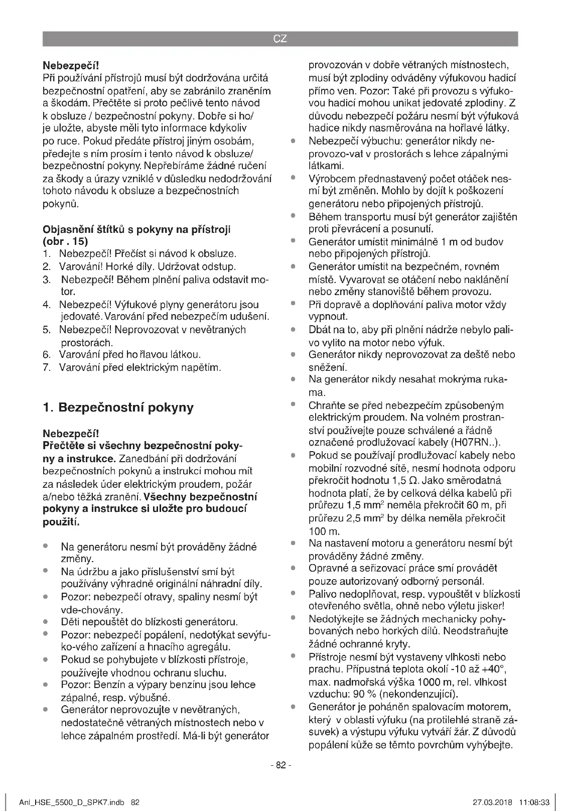 Generátor je poháněn spalovacím motorem, který v oblasti výfuku (na protilehlé straně zá- suvek) a výstupu výfuku vytváří žár. Z důvodů popálení kůže se těmto povrchům vyhýbejte. Anl_HSE_5500_D_SPK7.indb 82Anl_HSE_5500_D_SPK7.indb 82 27.03.2018 11:08:3327.03.2018 11:08:33CZ
