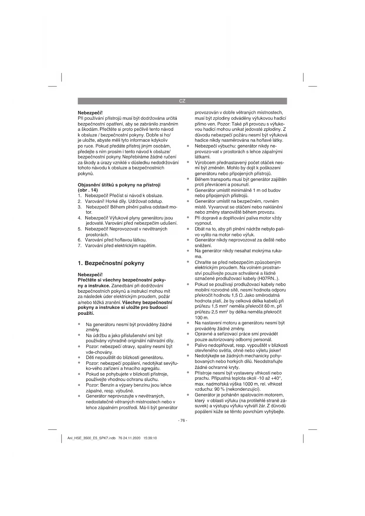 Generátor je poháněn spalovacím motorem, který v oblasti výfuku (na protilehlé straně zá- suvek) a výstupu výfuku vytváří žár. Z důvodů popálení kůže se těmto povrchům vyhýbejte. Anl_HSE_3500_E5_SPK7.indb 76 24.11.2020 15:39:10CZ