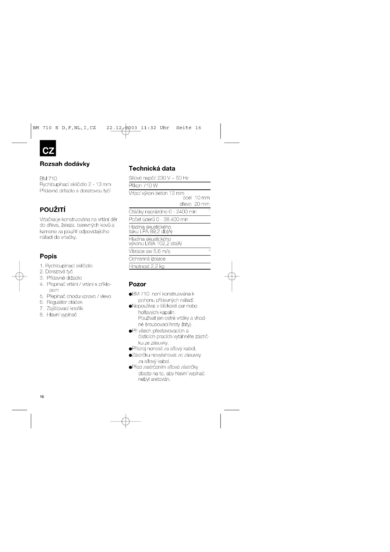 Ochranná izolace Hmotnost 2,2 kg Pozor BM 710 není konstruována k pohonu přídavných nářadí. Nepoužívat v blízkosti par nebo hořlavých kapalin. Používat jen ostré vrtáky a vhod- né šroubovací hroty (bity). Při všech přestavovacích a čisticích pracích vytáhněte zástrč- ku ze zásuvky. Přístroj nenosit za síťový kabel. Zástrčku nevytahovat ze zásuvky za síťový kabel. Před zastrčením síťové zástrčky dbejte na to, aby hlavní vypínač nebyl aretován. BM 710 E D,F,NL,I,CZ 22.12.2003 11:32 Uhr Seite 16CZ