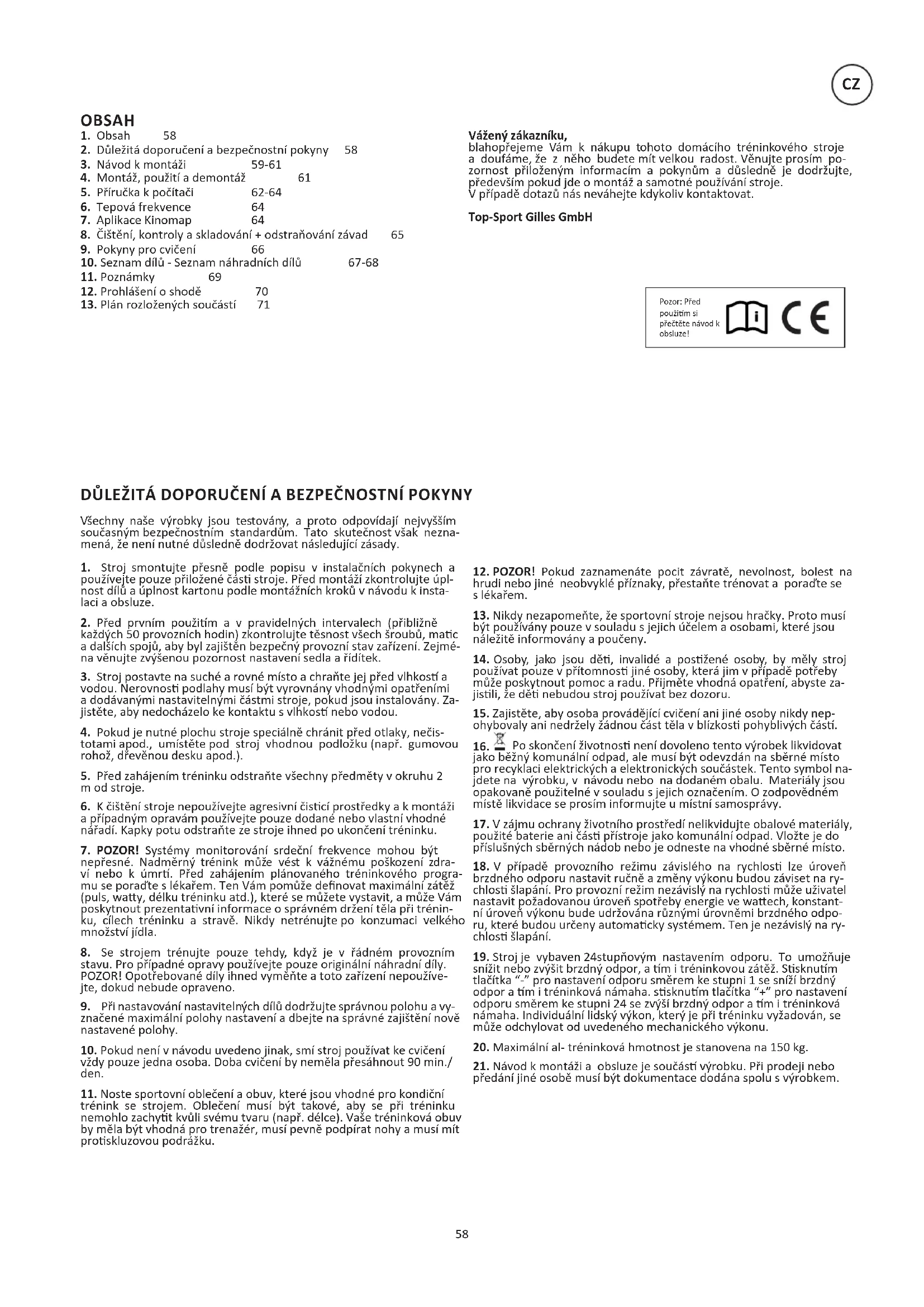 OBSAH Vážený zákazníku, blahopřejeme Vám k nákupu tohoto domácího tréninkového stroje a doufáme, že z něho budete mít velkou radost. Věnujte prosím po- zornost přiloženým informacím a pokynům a důsledně je dodržujte, především pokud jde o montáž a samotné používání stroje. V případě dotazů nás neváhejte kdykoliv kontaktovat. Top-Sport Gilles GmbH Pozor: Před použim si přečtěte návod k obsluze! DŮLEŽITÁ DOPORUČENÍ A BEZPEČNOSTNÍ POKYNY Všechny naše výrobky jsou testovány, a proto odpovídají nejvyšším současným bezpečnostním standardům. Tato skutečnost však nezna- mená, že není nutné důsledně dodržovat následující zásady.