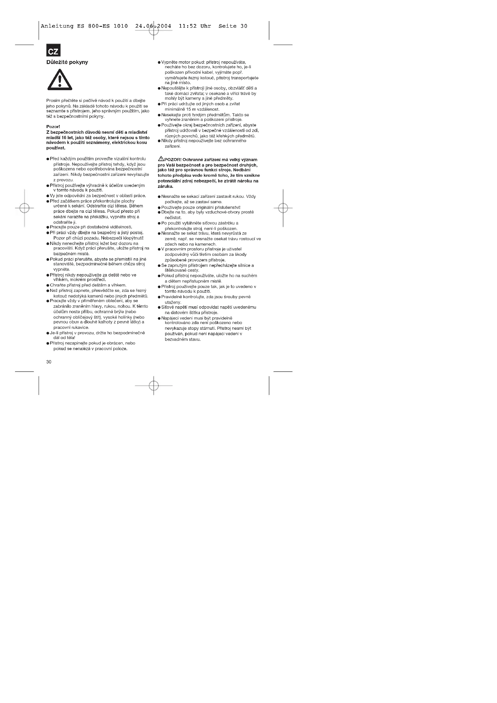 Anleitung ES 800-ES 1010 24.06.2004 11:52 Uhr Seite 30 Použitá napájecí vedení nesmí být lehčí než lehká vedení v pryžové hadici HO7RN-F podle DIN 57282/VDE 0282 a mít minimální průměr 1,5 mm