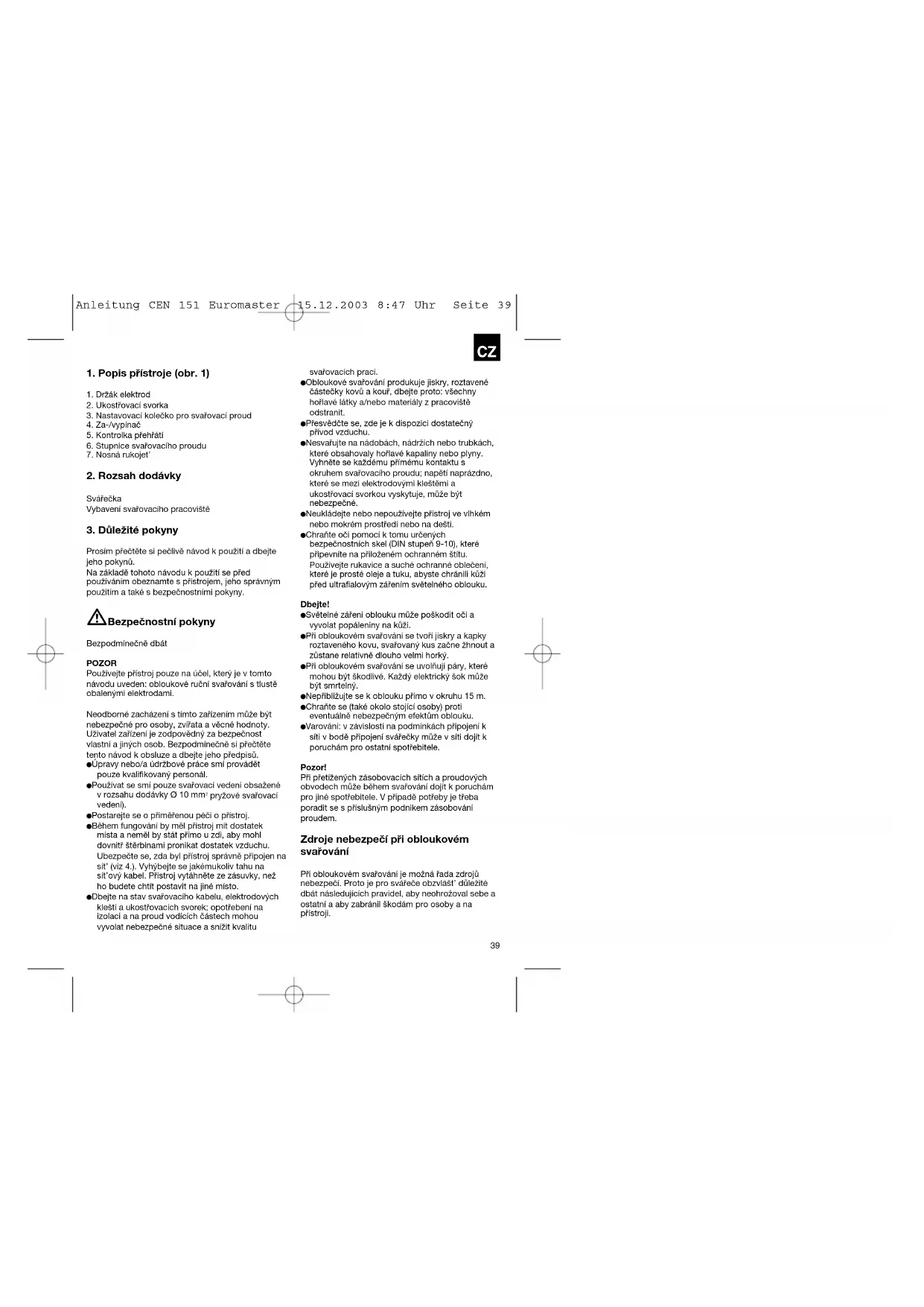 Anleitung CEN 151 Euromaster 15.12.2003 8:47 Uhr Seite 391. Práce na straně sít’ového napětí, např. na kabelech, zástrčkách, zásuvkách atd. nechat provést odborníkem. Toto platí především pro vytvoření mezikabelů.