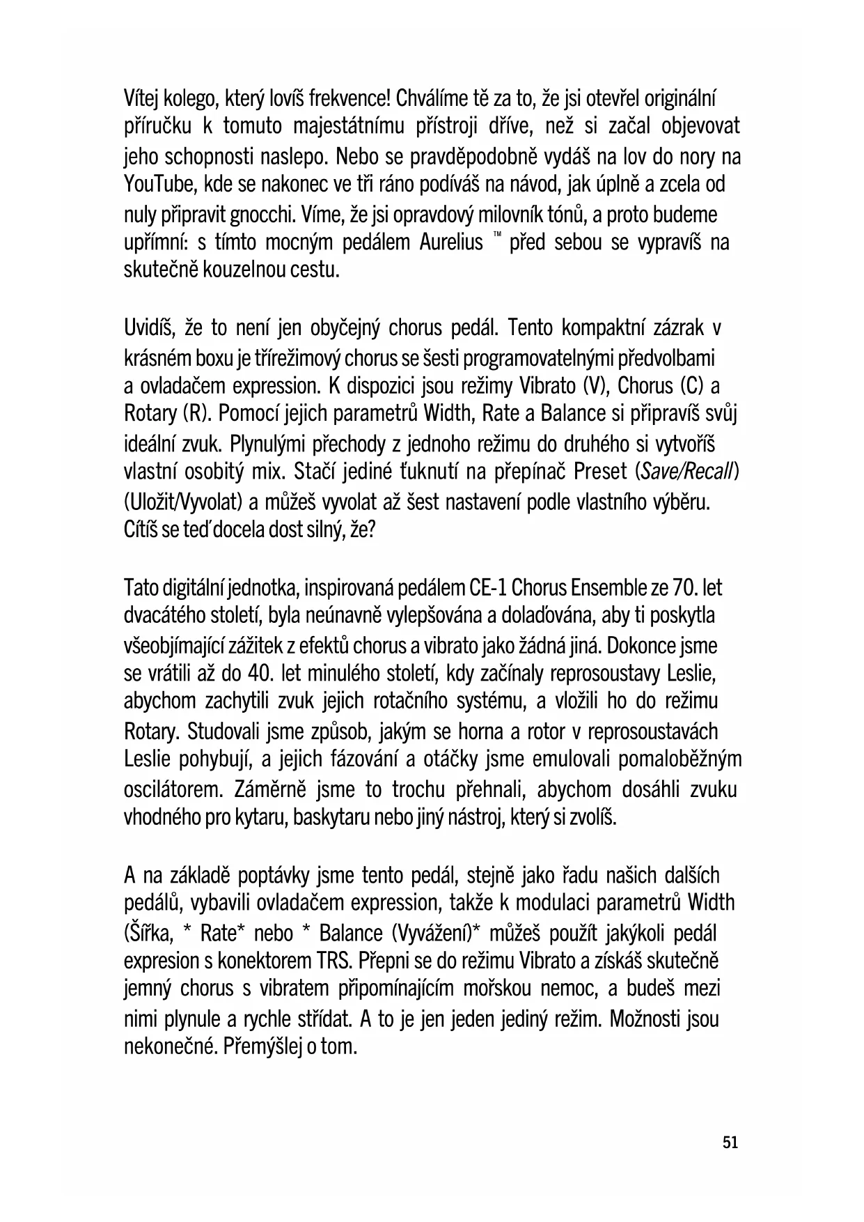 před sebou se vypravíš na skutečně kouzelnou cestu. Uvidíš, že to není jen obyčejný chorus pedál. Tento kompaktní zázrak v krásném boxu je třírežimový chorus se šesti programovatelnými předvolbami a ovladačem expression. K dispozici jsou režimy Vibrato (V), Chorus (C) a Rotary (R). Pomocí jejich parametrů Width, Rate a Balance si připravíš svůj ideální zvuk. Plynulými přechody z jednoho režimu do druhého si vytvoříš vlastní osobitý mix. Stačí jediné ťuknutí na přepínač Preset (Save/Recall) (Uložit/Vyvolat) a můžeš vyvolat až šest nastavení podle vlastního výběru. Cítíš se teď docela dost silný, že? Tato digitální jednotka, inspirovaná pedálem CE-1 Chorus Ensemble ze 70. let dvacátého století, byla neúnavně vylepšována a dolaďována, aby ti poskytla všeobjímající zážitek z efektů chorus a vibrato jako žádná jiná. Dokonce jsme se vrátili až do 40. let minulého století, kdy začínaly reprosoustavy Leslie, abychom zachytili zvuk jejich rotačního systému, a vložili ho do režimu Rotary. Studovali jsme způsob, jakým se horna a rotor v reprosoustavách Leslie pohybují, a jejich fázování a otáčky jsme emulovali pomaloběžným oscilátorem. Záměrně jsme to trochu přehnali, abychom dosáhli zvuku vhodného pro kytaru, baskytaru nebo jiný nástroj, který si zvolíš. A na základě poptávky jsme tento pedál, stejně jako řadu našich dalších pedálů, vybavili ovladačem expression, takže k modulaci parametrů Width (Šířka, * Rate* nebo * Balance (Vyvážení)* můžeš použít jakýkoli pedál expresion s konektorem TRS. Přepni se do režimu Vibrato a získáš skutečně jemný chorus s vibratem připomínajícím mořskou nemoc, a budeš mezi nimi plynule a rychle střídat. A to je jen jeden jediný režim. Možnosti jsou nekonečné. Přemýšlej o tom. 51Tento kompaktní svět chorusů v boxu se vejde na jakýkoli pedalboard a jeho používání je tak intuitivní a snadné, že už asi nebudeš muset do tohoto manuálu nikdy více nahlížet. Takže pokud se tu už neuvidíme, bylo nám potěšením a přejeme hodně štěstí s gnocchi. Každý jediný modul Aurelius se ručně vyrábí ve městě Akron, Ohio, USA a jeho výrobní kontrolu má na starosti duch inovátora reprosoustav Donalda Leslie.
