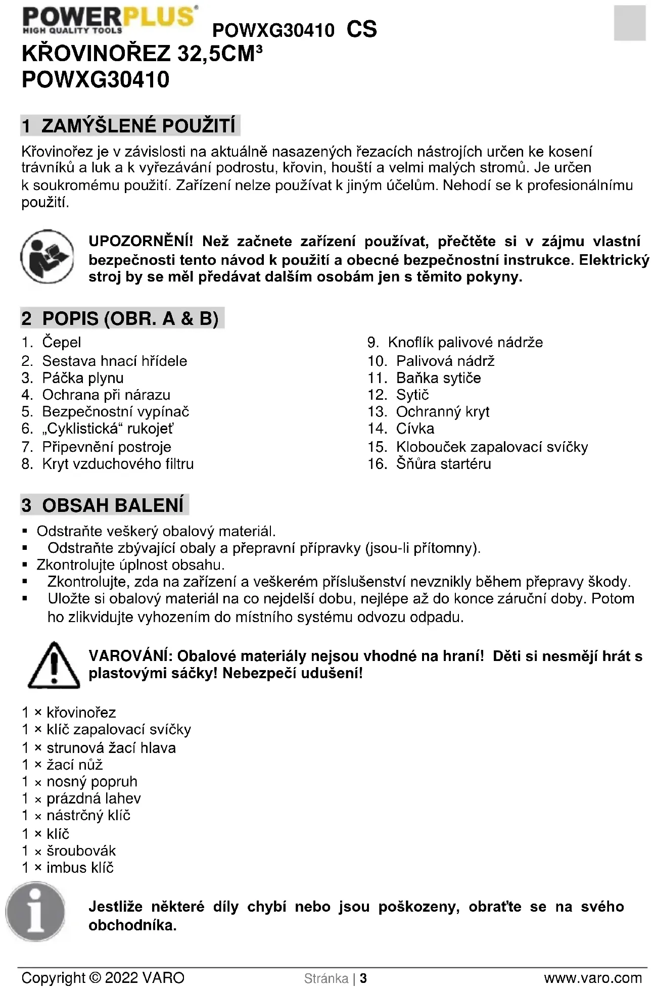 - Po zastavení motoru je tlumič výfuku ještě horký. Nikdy nepokládejte přístroj na místa, kde jsou hořlavé materiály (suchá tráva, atd.), hořlavé plyny nebo hořlavé kapaliny.POWXG30410 CS Copyright © 2022 VARO Stránka | 6 www.varo.com