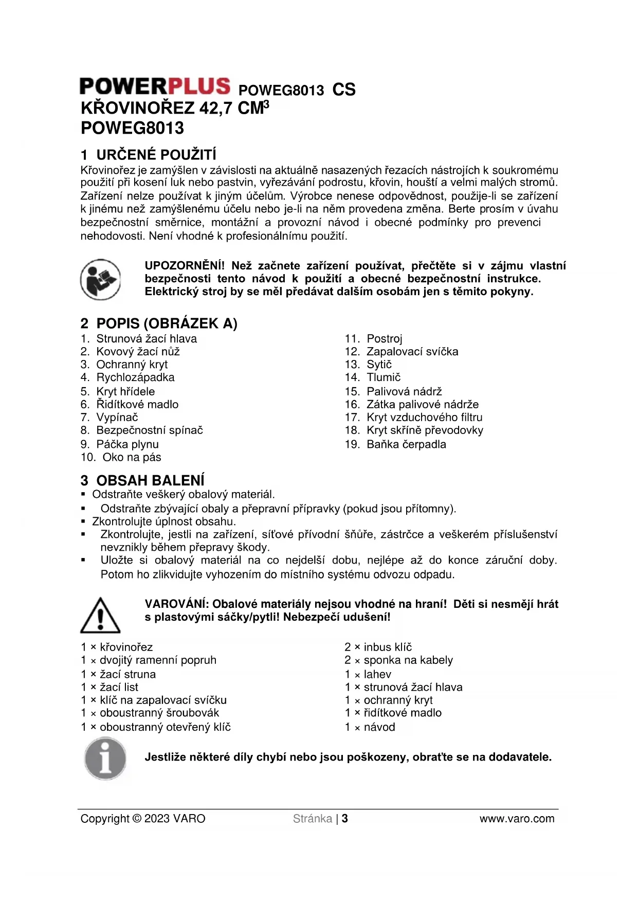- Uložte si obalový materiál na co nejdelší dobu, nejlépe až do konce záruční doby. Potom ho zlikvidujte vyhozením do místního systému odvozu odpadu. VAROVÁNÍ: Obalové materiály nejsou vhodné na hraní! Děti si nesmějí hrát s plastovými sáčky/pytli! Nebezpečí udušení! 1 × křovinořez 1 × dvojitý ramenní popruh 1 × žací struna 1 × žací list 1 × klíč na zapalovací svíčku 1 × oboustranný šroubovák 1 × oboustranný otevřený klíč 2 × inbus klíč 2 × sponka na kabely 1 × lahev 1 × strunová žací hlava 1 × ochranný kryt 1 × řidítkové madlo 1 × návod Jestliže některé díly chybí nebo jsou poškozeny, obraťte se na dodavatele.POWEG8013 CS Copyright © 2023 VARO Stránka | 4 www.varo.com 4 SYMBOLY V tomto návodu nebo na stroji se používají následující symboly: