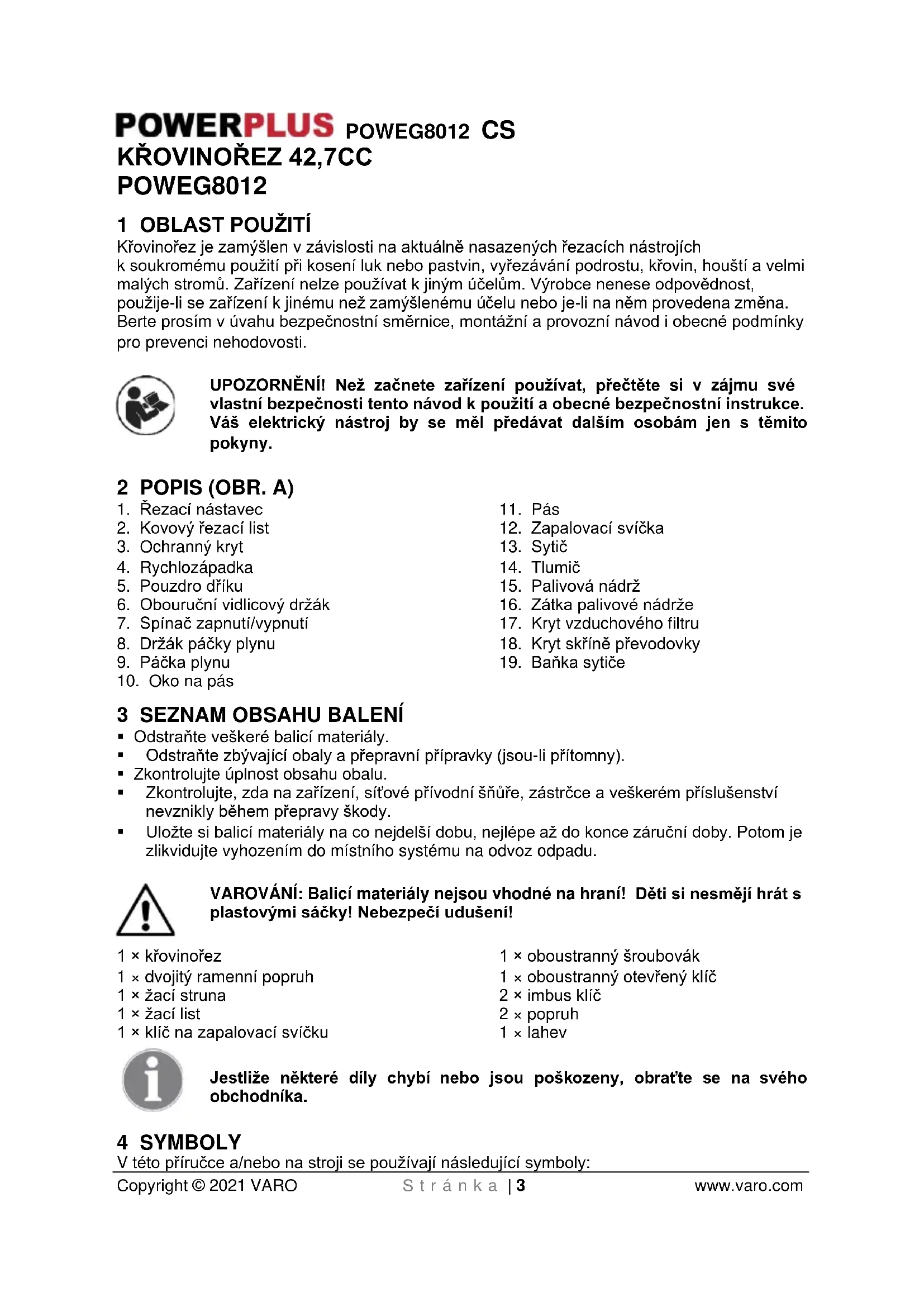 - Uložte si balicí materiály na co nejdelší dobu, nejlépe až do konce záruční doby. Potom je zlikvidujte vyhozením do místního systému na odvoz odpadu. VAROVÁNÍ: Balicí materiály nejsou vhodné na hraní! Děti si nesmějí hrát s plastovými sáčky! Nebezpečí udušení! 1 × křovinořez 1 × dvojitý ramenní popruh 1 × žací struna 1 × žací list 1 × klíč na zapalovací svíčku 1 × oboustranný šroubovák 1 × oboustranný otevřený klíč 2 × imbus klíč 2 × popruh 1 × lahev Jestliže některé díly chybí nebo jsou poškozeny, obraťte se na svého obchodníka. 4 SYMBOLY V této příručce a/nebo na stroji se používají následující symboly:POWEG8012 CS Copyright © 2021 VARO S t r á n k a | 4 www.varo.com