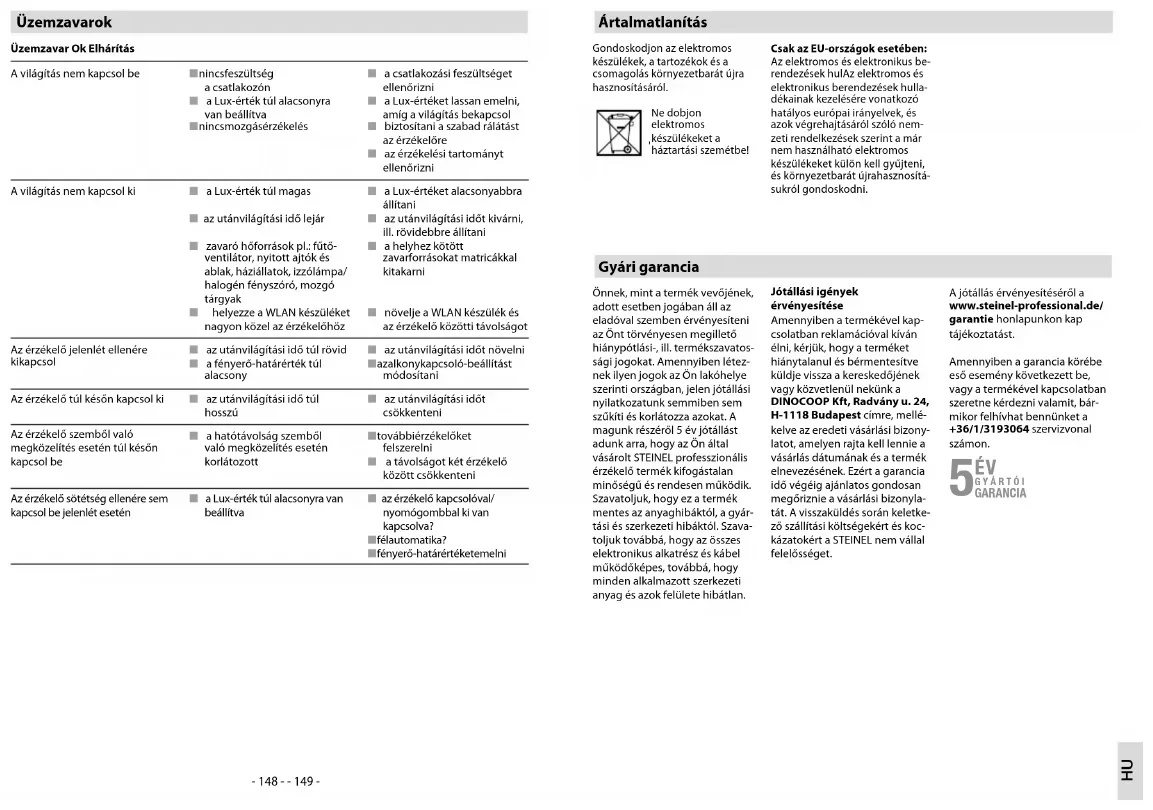 Hodnota základního jasu Stisknutím příslušných tlačítek >5 s se změní hodnota jasu v krocích po 10 % na: 1 = 10 %, 2 = 20 %, ... 6 = 60 % Stmívání pomocí tlačítka U tlačítka připojeného ke svorce S lze osvětlení stmívat po stisknutí tlačítka. Tlačítko nejdříve nastaví maximální hodnotu a pak se vrátí k minimální hodnotě. Po uvolnění tlačítka zůstane příslušná hodnota zachována bez další regulace až k vypnutí. V návaznosti se hlásič nachází v dříve nastaveném senzorovém provozu. Směr stmívání (max./min.) může být změněn krátkým uvolněním a opětovným stisknutím tlačítka.- 38 - - 39 - Záruka výrobce Jako kupujícímu vám vůči prodá-vajícímu přináleží zákonem pře-depsaná práva. Pokud tato práva ve vaší zemi existují, nejsou na-ším prohlášením o záruce zkrá-cena ani omezena. Poskytneme vám 5 letou záruku na bezvadné provedení a řádnou funkčnost vašeho profesionálního senzoric-kého výrobku značky STEINEL. Ručíme za to, že tento výrobek nemá materiálové, výrobní a konstrukční vady. Ručíme za funkčnost všech elektronických součástek a kabelů, i za nezávad-nost všech použitých materiálů a jejich povrchů. Uplatňování zárukyChcete-li váš výrobek reklamo-vat, zašlete jej nedemontovaný a vyplaceně s originálním dokla-dem o koupi, který musí obsaho-vat datum koupě a název výrob-ku, vašemu prodejci nebo přímo nám, na adresu NECO SK, a.s. Ružová 111, 019 01 Ilava. Dopo-ručujeme vám, abyste doklad o koupi do uplynutí záruční do-by pečlivě uschovali. Společnost STEINEL neručí za přepravní ná-klady a rizika týkající se zpětné-ho zaslání.Další informace k uplatňování záruky jsou uvedeny na naší webové stránce www.neco.skJestliže budete uplatňovat rekla-maci nebo máte nějaké dotazy týkající se výrobku, můžete nám kdykoli zavolat na servisní hor-kou linku +421/42/4 45 67 10. Provozní poruchy Porucha Příčina NápravaOsvětlení se nezapínáL Bez napájecího napětí.L Nastavena příliš nízká hodnota lx.L Bez záchytu pohybu.L Zkontrolovat připojovací napětí.L Hodnotu lx pomalu zvyšovat, až se zapne světlo.L Vytvořit volný výhled na senzor.L Zkontrolovat oblast záchytu.Osvětlení se nevypínáL Hodnota lx příliš vysoká.L Uběhla doba doběhu.L Rušivé tepelné zdroje, např.: topný ventilátor, otevřené dveře a okna, domácí zvířata, žárovka/halogenový reflek-tor, pohybující se objekty.L Zařízení WLAN umístit velmi blízko senzoru.L Nastavit nižší hodnotu lx.L Vyčkat na dobu doběhu, event. nastavit kratší dobu doběhu.L Stacionární poruchové zdroje potlačit nálepkami.L Zvětšit vzdálenost mezi zařízením WLAN a senzorem.Senzor vypne i přes přítomnostL Doba doběhu příliš krátká.L Světelný práh příliš nízký.L Prodloužit dobu doběhu.L Změnit soumrakové nastavení.Senzor vypíná příliš pozděL Doba doběhu příliš dlouhá. L Zkrátit dobu doběhu.Senzor u čelního směru chůze zapíná příliš pozděL Dosah je u čelního směru chůze snížen.L Namontovat další senzory.L Zkrátit vzdálenost mezi dvěma senzory.Senzor i přes tmu v přítomnosti osoby nezapínáL Zvolena příliš nízká hodnota lx. L Senzor se spínačem/ tlačítkem deaktivován?L Poloautomatika?L Zvýšit práh světelnosti.