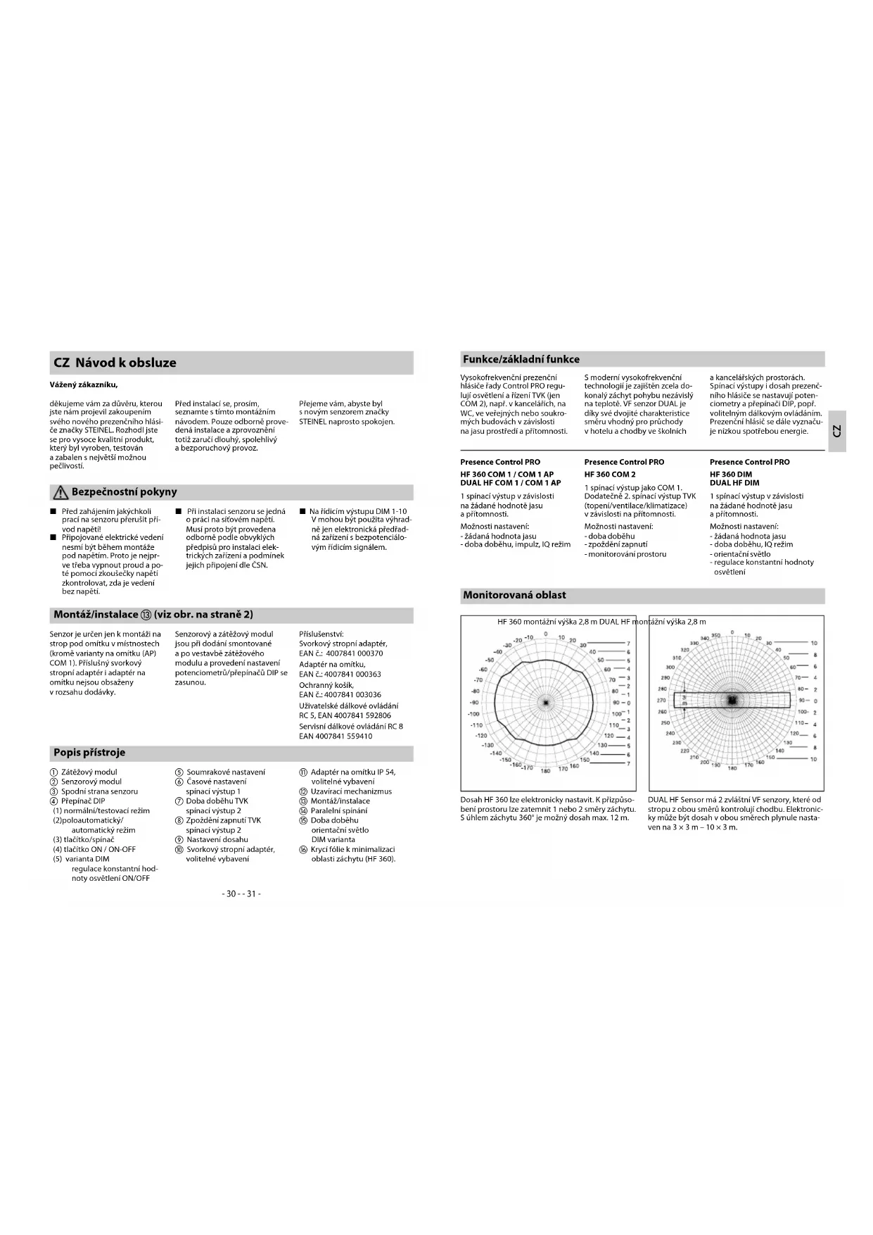 L Před zahájením jakýchkoli prací na senzoru přerušit pří- vod napětí! L Připojované elektrické vedení nesmí být během montáže pod napětím. Proto je nejpr- ve třeba vypnout proud a po- té pomocí zkoušečky napětí zkontrolovat, zda je vedení bez napětí. L Při instalaci senzoru se jedná o práci na síťovém napětí. Musí proto být provedena odborně podle obvyklých předpisů pro instalaci elek- trických zařízení a podmínek jejich připojení dle ČSN. L Na řídicím výstupu DIM 1-10 V mohou být použita výhrad- ně jen elektronická předřad- ná zařízení s bezpotenciálo- vým řídicím signálem. Popis přístroje a Zátěžový modul b Senzorový modul c Spodní strana senzoru d Přepínač DIP (1) normální/testovací režim (2) poloautomatický/ automatický režim (3) tlačítko/spínač (4) tlačítko ON / ON-OFF (5) varianta DIM regulace konstantní hod- noty osvětlení ON/OFF e Soumrakové nastavení f Časové nastavení spínací výstup 1 g Doba doběhu TVK spínací výstup 2 h Zpoždění zapnutí TVK spínací výstup 2 i Nastavení dosahu j Svorkový stropní adaptér, volitelné vybavení k Adaptér na omítku IP 54, volitelné vybavení l Uzavírací mechanizmus m Montáž/instalace n Paralelní spínání o Doba doběhu orientační světlo DIM varianta p Krycí fólie k minimalizaci oblasti záchytu (HF 360). Montáž/instalace m (viz obr. na straně 2) Senzor je určen jen k montáži na strop pod omítku v místnostech (kromě varianty na omítku (AP) COM 1). Příslušný svorkový stropní adaptér i adaptér na omítku nejsou obsaženy v rozsahu dodávky. Senzorový a zátěžový modul jsou při dodání smontované a po vestavbě zátěžového modulu a provedení nastavení potenciometrů/přepínačů DIP se zasunou. Příslušenství: Svorkový stropní adaptér, EAN č.: 4007841 000370 Adaptér na omítku, EAN č.: 4007841 000363 Ochranný košík, EAN č.: 4007841 003036 Uživatelské dálkové ovládání RC 5, EAN 4007841 592806 Servisní dálkové ovládání RC 8 EAN 4007841 559410 CZ Návod k obsluze Vážený zákazníku, děkujeme vám za důvěru, kterou jste nám projevil zakoupením svého nového prezenčního hlási- če značky STEINEL. Rozhodl jste se pro vysoce kvalitní produkt, který byl vyroben, testován a zabalen s největší možnou pečlivostí. Před instalací se, prosím, seznamte s tímto montážním návodem. Pouze odborně prove- dená instalace a zprovoznění totiž zaručí dlouhý, spolehlivý a bezporuchový provoz. Přejeme vám, abyste byl s novým senzorem značky STEINEL naprosto spokojen. Bezpečnostní pokyny Funkce/základní funkce Vysokofrekvenční prezenční hlásiče řady Control PRO regu- lují osvětlení a řízení TVK (jen COM 2), např. v kancelářích, na WC, ve veřejných nebo soukro- mých budovách v závislosti na jasu prostředí a přítomnosti. S moderní vysokofrekvenční technologií je zajištěn zcela do- konalý záchyt pohybu nezávislý na teplotě. VF senzor DUAL je díky své dvojité charakteristice směru vhodný pro průchody v hotelu a chodby ve školních a kancelářských prostorách. Spínací výstupy i dosah prezenč- ního hlásiče se nastavují poten- ciometry a přepínači DIP, popř. volitelným dálkovým ovládáním. Prezenční hlásič se dále vyznaču- je nízkou spotřebou energie. Presence Control PRO