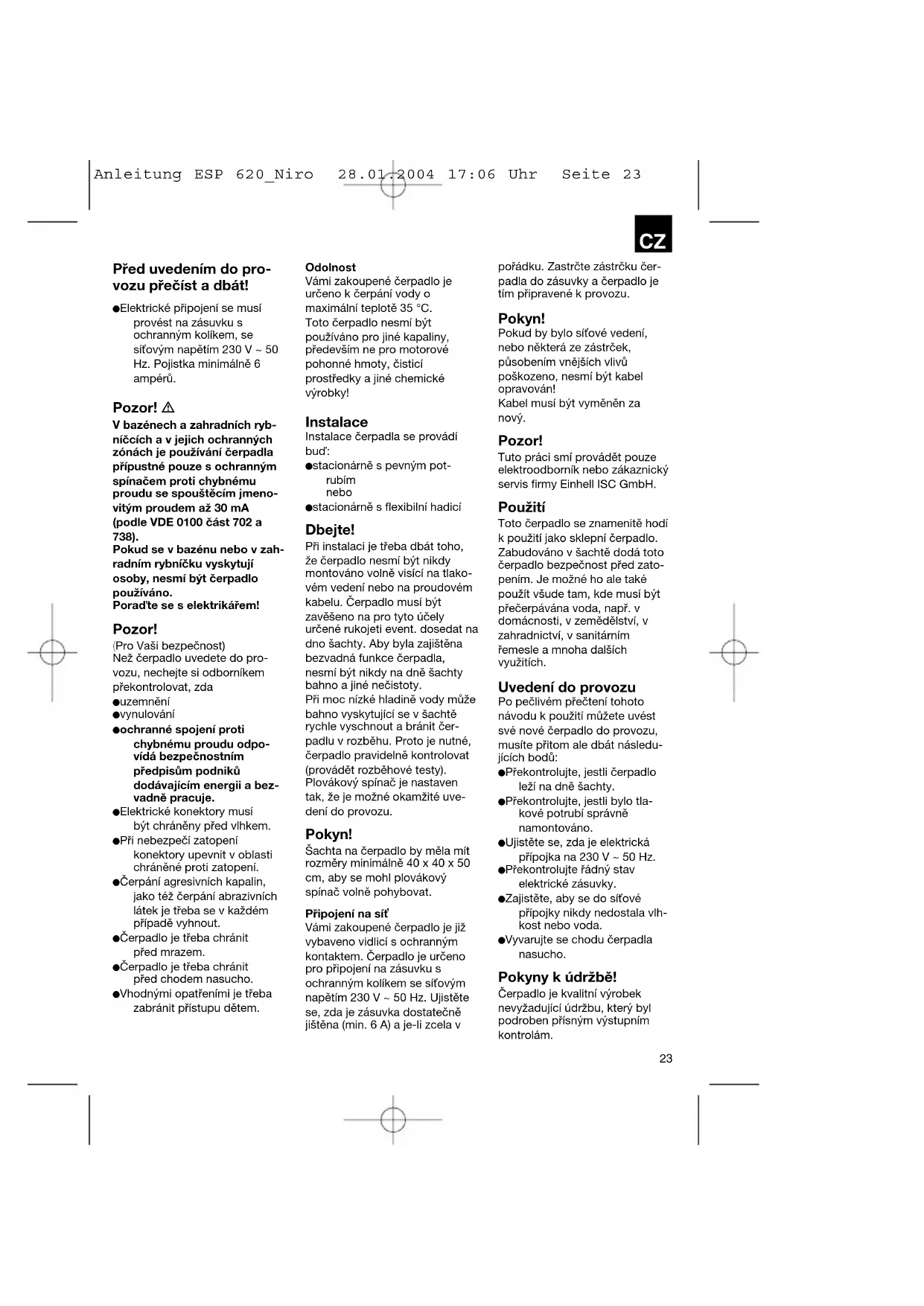 Dopravná výška Čerpací výkon 1m max.: 16.500 l/h 2m max.: 15.600 l/h 3m max.: 14.400 l/h 4m max.: 12.900 l/h 5m max.: 11.100 l/h 6m max.: 9.000 l/h Anleitung ESP 620_Niro 28.01.2004 17:06 Uhr Seite 22CZ Před uvedením do pro- vozu přečíst a dbát! Elektrické připojení se musí provést na zásuvku s ochranným kolíkem, se síťovým napětím 230 V ~ 50 Hz. Pojistka minimálně 6 ampérů. Pozor! V bazénech a zahradních ryb- níčcích a v jejich ochranných zónách je používání čerpadla přípustné pouze s ochranným spínačem proti chybnému proudu se spouštěcím jmeno- vitým proudem až 30 mA (podle VDE 0100 část 702 a 738). Pokud se v bazénu nebo v zah- radním rybníčku vyskytují osoby, nesmí být čerpadlo používáno. Poraďte se s elektrikářem! Pozor! (Pro Vaši bezpečnost) Než čerpadlo uvedete do pro- vozu, nechejte si odborníkem překontrolovat, zda uzemnění vynulování ochranné spojení proti chybnému proudu odpo- vídá bezpečnostním předpisům podniků dodávajícím energii a bez- vadně pracuje. Elektrické konektory musí být chráněny před vlhkem. Při nebezpečí zatopení konektory upevnit v oblasti chráněné proti zatopení. Čerpání agresivních kapalin, jako též čerpání abrazivních látek je třeba se v každém případě vyhnout. Čerpadlo je třeba chránit před mrazem. Čerpadlo je třeba chránit před chodem nasucho. Vhodnými opatřeními je třeba zabránit přístupu dětem. Odolnost Vámi zakoupené čerpadlo je určeno k čerpání vody o maximální teplotě 35 °C. Toto čerpadlo nesmí být používáno pro jiné kapaliny, především ne pro motorové pohonné hmoty, čisticí prostředky a jiné chemické výrobky! Instalace Instalace čerpadla se provádí buď: stacionárně s pevným pot- rubím nebo stacionárně s flexibilní hadicí Dbejte! Při instalaci je třeba dbát toho, že čerpadlo nesmí být nikdy montováno volně visící na tlako- vém vedení nebo na proudovém kabelu. Čerpadlo musí být zavěšeno na pro tyto účely určené rukojeti event. dosedat na dno šachty. Aby byla zajištěna bezvadná funkce čerpadla, nesmí být nikdy na dně šachty bahno a jiné nečistoty. Při moc nízké hladině vody může bahno vyskytující se v šachtě rychle vyschnout a bránit čer- padlu v rozběhu. Proto je nutné, čerpadlo pravidelně kontrolovat (provádět rozběhové testy). Plovákový spínač je nastaven tak, že je možné okamžité uve- dení do provozu. Pokyn! Šachta na čerpadlo by měla mít rozměry minimálně 40 x 40 x 50 cm, aby se mohl plovákový spínač volně pohybovat. Připojení na síť Vámi zakoupené čerpadlo je již vybaveno vidlicí s ochranným kontaktem. Čerpadlo je určeno pro připojení na zásuvku s ochranným kolíkem se síťovým napětím 230 V ~ 50 Hz. Ujistěte se, zda je zásuvka dostatečně jištěna (min. 6 A) a je-li zcela v pořádku. Zastrčte zástrčku čer- padla do zásuvky a čerpadlo je tím připravené k provozu. Pokyn! Pokud by bylo síťové vedení, nebo některá ze zástrček, působením vnějších vlivů poškozeno, nesmí být kabel opravován! Kabel musí být vyměněn za nový. Pozor! Tuto práci smí provádět pouze elektroodborník nebo zákaznický servis firmy Einhell ISC GmbH. Použití Toto čerpadlo se znamenitě hodí k použití jako sklepní čerpadlo. Zabudováno v šachtě dodá toto čerpadlo bezpečnost před zato- pením. Je možné ho ale také použít všude tam, kde musí být přečerpávána voda, např. v domácnosti, v zemědělství, v zahradnictví, v sanitárním řemesle a mnoha dalších využitích. Uvedení do provozu Po pečlivém přečtení tohoto návodu k použití můžete uvést své nové čerpadlo do provozu, musíte přitom ale dbát následu- jících bodů: Překontrolujte, jestli čerpadlo leží na dně šachty. Překontrolujte, jestli bylo tla- kové potrubí správně namontováno. Ujistěte se, zda je elektrická přípojka na 230 V ~ 50 Hz. Překontrolujte řádný stav elektrické zásuvky. Zajistěte, aby se do síťové přípojky nikdy nedostala vlh- kost nebo voda. Vyvarujte se chodu čerpadla nasucho. Pokyny k údržbě! Čerpadlo je kvalitní výrobek nevyžadující údržbu, který byl podroben přísným výstupním kontrolám.
