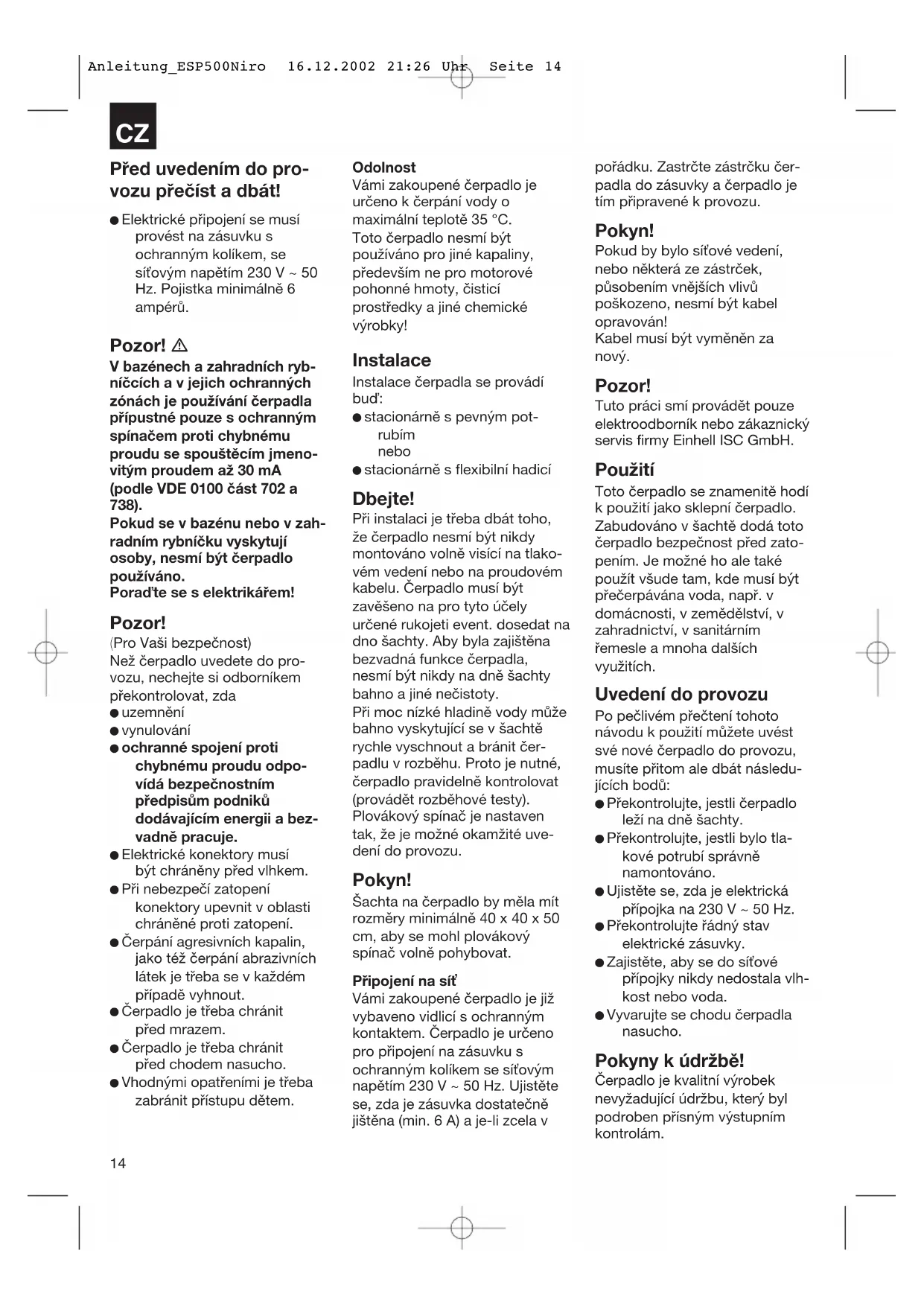 Altezza di mandata 7,5 m Profondità massima immersione 5 m Temperatura massima acqua 35°C gamento tubo 1 1/2” AG Corpi estranei fino a Ø 18 mm altezza del punto di commutazione: ACCESO 50 cm altezza del punto di commutazione: SPENTO 5 cm N° dell’art. 41.705.11 Dati tecnici Prestazioni prevalenza portata ESP 500 NIRO 1m max.: 16.500 l/h 2m max.: 15.600 l/h 3m max.: 14.400 l/h 4m max.: 12.900 l/h 5m max.: 11.100 l/h 6m max.: 19.000 l/h Anleitung_ESP500Niro 16.12.2002 21:26 Uhr Seite 13CZ Před uvedením do pro- vozu přečíst a dbát! Elektrické připojení se musí provést na zásuvku s ochranným kolíkem, se síťovým napětím 230 V ~ 50 Hz. Pojistka minimálně 6 ampérů. Pozor! V bazénech a zahradních ryb- níčcích a v jejich ochranných zónách je používání čerpadla přípustné pouze s ochranným spínačem proti chybnému proudu se spouštěcím jmeno- vitým proudem až 30 mA (podle VDE 0100 část 702 a 738). Pokud se v bazénu nebo v zah- radním rybníčku vyskytují osoby, nesmí být čerpadlo používáno. Poraďte se s elektrikářem! Pozor! (Pro Vaši bezpečnost) Než čerpadlo uvedete do pro- vozu, nechejte si odborníkem překontrolovat, zda uzemnění vynulování ochranné spojení proti chybnému proudu odpo- vídá bezpečnostním předpisům podniků dodávajícím energii a bez- vadně pracuje. Elektrické konektory musí být chráněny před vlhkem. Při nebezpečí zatopení konektory upevnit v oblasti chráněné proti zatopení. Čerpání agresivních kapalin, jako též čerpání abrazivních látek je třeba se v každém případě vyhnout. Čerpadlo je třeba chránit před mrazem. Čerpadlo je třeba chránit před chodem nasucho. Vhodnými opatřeními je třeba zabránit přístupu dětem. Odolnost Vámi zakoupené čerpadlo je určeno k čerpání vody o maximální teplotě 35 °C. Toto čerpadlo nesmí být používáno pro jiné kapaliny, především ne pro motorové pohonné hmoty, čisticí prostředky a jiné chemické výrobky! Instalace Instalace čerpadla se provádí buď: stacionárně s pevným pot- rubím nebo stacionárně s flexibilní hadicí Dbejte! Při instalaci je třeba dbát toho, že čerpadlo nesmí být nikdy montováno volně visící na tlako- vém vedení nebo na proudovém kabelu. Čerpadlo musí být zavěšeno na pro tyto účely určené rukojeti event. dosedat na dno šachty. Aby byla zajištěna bezvadná funkce čerpadla, nesmí být nikdy na dně šachty bahno a jiné nečistoty. Při moc nízké hladině vody může bahno vyskytující se v šachtě rychle vyschnout a bránit čer- padlu v rozběhu. Proto je nutné, čerpadlo pravidelně kontrolovat (provádět rozběhové testy). Plovákový spínač je nastaven tak, že je možné okamžité uve- dení do provozu. Pokyn! Šachta na čerpadlo by měla mít rozměry minimálně 40 x 40 x 50 cm, aby se mohl plovákový spínač volně pohybovat. Připojení na síť Vámi zakoupené čerpadlo je již vybaveno vidlicí s ochranným kontaktem. Čerpadlo je určeno pro připojení na zásuvku s ochranným kolíkem se síťovým napětím 230 V ~ 50 Hz. Ujistěte se, zda je zásuvka dostatečně jištěna (min. 6 A) a je-li zcela v pořádku. Zastrčte zástrčku čer- padla do zásuvky a čerpadlo je tím připravené k provozu. Pokyn! Pokud by bylo síťové vedení, nebo některá ze zástrček, působením vnějších vlivů poškozeno, nesmí být kabel opravován! Kabel musí být vyměněn za nový. Pozor! Tuto práci smí provádět pouze elektroodborník nebo zákaznický servis firmy Einhell ISC GmbH. Použití Toto čerpadlo se znamenitě hodí k použití jako sklepní čerpadlo. Zabudováno v šachtě dodá toto čerpadlo bezpečnost před zato- pením. Je možné ho ale také použít všude tam, kde musí být přečerpávána voda, např. v domácnosti, v zemědělství, v zahradnictví, v sanitárním řemesle a mnoha dalších využitích. Uvedení do provozu Po pečlivém přečtení tohoto návodu k použití můžete uvést své nové čerpadlo do provozu, musíte přitom ale dbát následu- jících bodů: Překontrolujte, jestli čerpadlo leží na dně šachty. Překontrolujte, jestli bylo tla- kové potrubí správně namontováno. Ujistěte se, zda je elektrická přípojka na 230 V ~ 50 Hz. Překontrolujte řádný stav elektrické zásuvky. Zajistěte, aby se do síťové přípojky nikdy nedostala vlh- kost nebo voda. Vyvarujte se chodu čerpadla nasucho. Pokyny k údržbě! Čerpadlo je kvalitní výrobek nevyžadující údržbu, který byl podroben přísným výstupním kontrolám.
