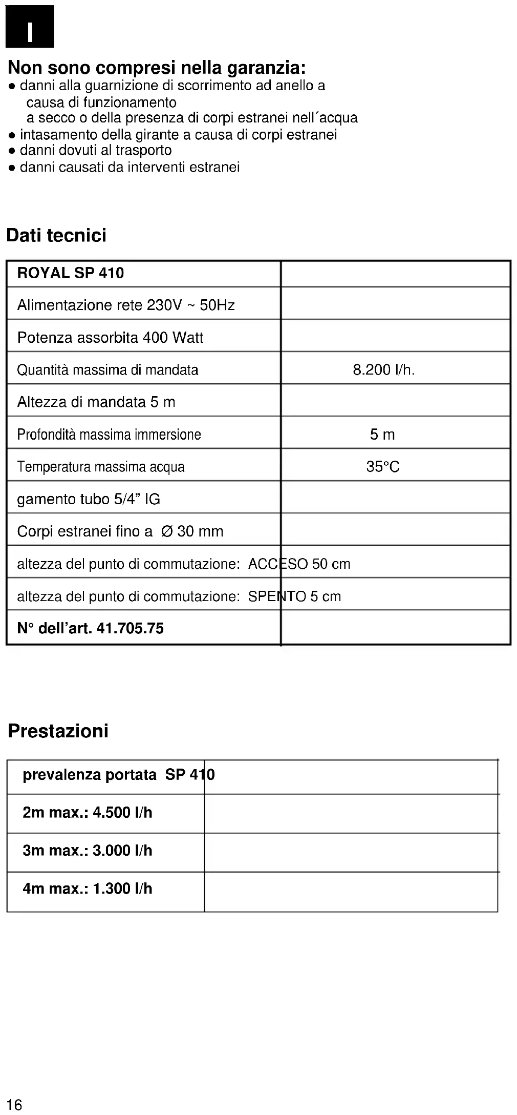 Altezza di mandata 5 m Profondità massima immersione 5 m Temperatura massima acqua 35°C gamento tubo 5/4” IG Corpi estranei fino a Ø 30 mm altezza del punto di commutazione: ACCESO 50 cm altezza del punto di commutazione: SPENTO 5 cm N° dell’art. 41.705.75 Dati tecnici Prestazioni prevalenza portata SP 410 2m max.: 4.500 l/h 3m max.: 3.000 l/h 4m max.: 1.300 l/hCZ Před uvedením do pro- vozu přečíst a dbát! Elektrické připojení se musí provést na zásuvku s ochranným kolíkem, se síťovým napětím 230 V ~ 50 Hz. Pojistka minimálně 6 ampérů. Pozor! V bazénech a zahradních ryb- níčcích a v jejich ochranných zónách je používání čerpadla přípustné pouze s ochranným spínačem proti chybnému proudu se spouštěcím jmeno- vitým proudem až 30 mA (podle VDE 0100 část 702 a 738). Pokud se v bazénu nebo v zah- radním rybníčku vyskytují osoby, nesmí být čerpadlo používáno. Poraďte se s elektrikářem! Pozor! (Pro Vaši bezpečnost) Než čerpadlo uvedete do provozu, nechejte si odborníkem překontro- lovat, zda uzemnění vynulování ochranné spojení proti chybnému proudu odpo- vídá bezpečnostním předpisům podniků dodávajícím energii a bez- vadně pracuje. Elektrické konektory musí být chráněny před vlhkem. Při nebezpečí zatopení konek- tory upevnit v oblasti chráněné proti zatopení. Čerpání agresivních kapalin, jako též čerpání abrazivních látek je třeba se v každém případě vyhnout. Čerpadlo je třeba chránit před mrazem. Čerpadlo je třeba chránit před chodem nasucho. Vhodnými opatřeními je třeba zabránit přístupu dětem. Odolnost Vámi zakoupené čerpadlo je určeno k čerpání vody o maximální teplotě 35 °C. Toto čerpadlo nesmí být používáno pro jiné kapaliny, především ne pro motorové pohonné hmoty, čisticí prostředky a jiné chemické výrobky! Instalace Instalace čerpadla se provádí buď: stacionárně s pevným potrubím nebo stacionárně s flexibilní hadicí Dbejte! Při instalaci je třeba dbát toho, že čerpadlo nesmí být nikdy monto- váno volně visící na tlakovém vedení nebo na proudovém kabelu. Čerpadlo musí být zavěšeno na pro tyto účely určené rukojeti event. dosedat na dno šachty. Aby byla zajištěna bezvadná funkce čer- padla, nesmí být nikdy na dně šachty bahno a jiné nečistoty. Při moc nízké hladině vody může bahno vyskytující se v šachtě rychle vyschnout a bránit čerpadlu v rozběhu. Proto je nutné, čerpadlo pravidelně kontrolovat (provádět rozběhové testy). Plovákový spínač je nastaven tak, že je možné okamžité uvedení do provozu. Pokyn! Šachta na čerpadlo by měla mít rozměry minimálně 40 x 40 x 50 cm, aby se mohl plovákový spínač volně pohybovat. Připojení na síť Vámi zakoupené čerpadlo je již vybaveno vidlicí s ochranným kon- taktem. Čerpadlo je určeno pro připojení na zásuvku s ochranným kolíkem se síťovým napětím 230 V ~ 50 Hz. Ujistěte se, zda je zásuvka dostatečně jištěna (min. 6 A) a je-li zcela v pořádku. Zastrčte zástrčku čerpadla do zásuvky a čerpadlo je tím připravené k provozu. Pokyn! Pokud by bylo síťové vedení, nebo některá ze zástrček, působením vnějších vlivů poškozeno, nesmí být kabel opravován! Kabel musí být vyměněn za nový. Pozor! Tuto práci smí provádět pouze elek- troodborník nebo zákaznický servis firmy Einhell ISC GmbH. Použití Toto čerpadlo se znamenitě hodí k použití jako sklepní čerpadlo. Zabu- dováno v šachtě dodá toto čer- padlo bezpečnost před zatopením. Je možné ho ale také použít všude tam, kde musí být přečerpávána voda, např. v domácnosti, v zemědělství, v zahradnictví, v sanitárním řemesle a mnoha dalších využitích. Uvedení do provozu Po pečlivém přečtení tohoto návodu k použití můžete uvést své nové čerpadlo do provozu, musíte přitom ale dbát následujících bodů: Překontrolujte, jestli čerpadlo leží na dně šachty. Překontrolujte, jestli bylo tlakové potrubí správně namontováno. Ujistěte se, zda je elektrická přípojka na 230 V ~ 50 Hz. Překontrolujte řádný stav elek- trické zásuvky. Zajistěte, aby se do síťové přípojky nikdy nedostala vlhkost nebo voda. Vyvarujte se chodu čerpadla nasucho. Pokyny k údržbě! Čerpadlo je kvalitní výrobek nevyžadující údržbu, který byl podroben přísným výstupním kon- trolám. V zájmu dlouhé životnosti a pro nepřerušovaný provoz přesto doporučujeme pravidelnou kontrolu a péči. Pozor! Důležité! Před každou údržbovou prací vytáhnout síťovou zástrčku. Při mobilním použití by mělo být čerpadlo po každém použití vyčištěno čistou vodou. Při pevné instalaci doporuču- jeme každé 3 měsíce překon- trolovat funkci plovákového spínače. Chlupy a částečky vláknité struktury, které se eventuálně usadily v plášti čerpadla, odstranit proudem vody. Každé 3 měsíce odstranit bahno ze dna šachty a vyčistit také stěny šachty. Plovákový spínač vyčistit čistou vodou od usazenin. Čištění oběžného kola Při moc silných usazeninách v plášti čerpadla musí být spodní část čer- padla podle následujícího postupu rozebrána: