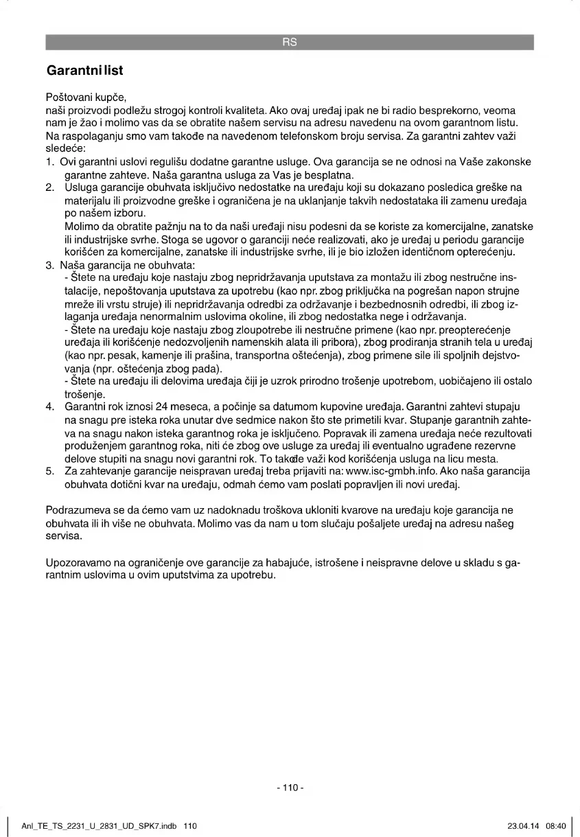 gmbh.info. Pokud je defekt přístroje zahrnut v naší záruce, obdržíte obratem zpátky opravený nebo nový přístroj. Samozřejmě Vám rádi odstraníme nedostatky na přístroji na Vaše náklady, pokud tyto nedostatky nej- sou nebo už nejsou zahrnuty v rozsahu záruky. V takovém případě nám prosím zašlete přístroj na naší servisní adresu. V případě rychle opotřebitelných dílů, spotřebních dílů a chybějících dílů poukazujeme na omezení této záruky podle servisních informací uvedených v tomto návodu k obsluze. Anl_TE_TS_2231_U_2831_UD_SPK7.indb 124Anl_TE_TS_2231_U_2831_UD_SPK7.indb 124 23.04.14 08:4023.04.14 08:40NL