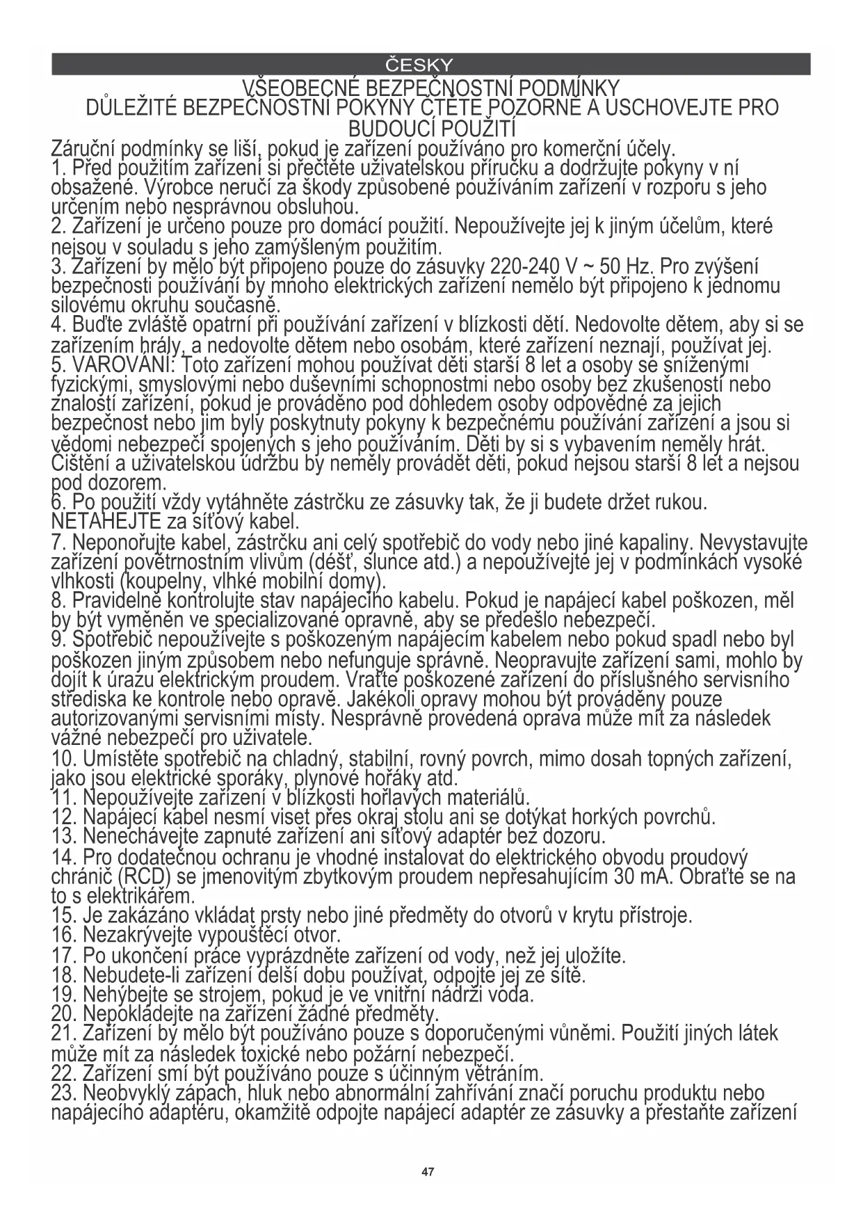 3. Zařízení by mělo být připojeno pouze do zásuvky 220-240 V ~ 50 Hz. Pro zvýšení
