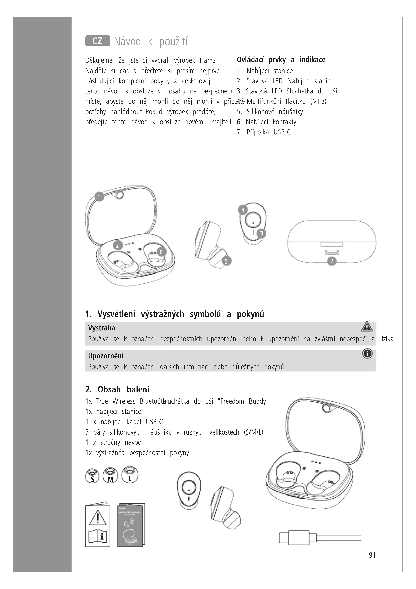 sluchátka do uší "Freedom Buddy" 1x nabíjecí stanice 1 x nabíjecí kabel USB-C 3 páry silikonových náušníků v různých velikostech (S/M/L) 1 x stručný návod 1x výstražnéa bezpečnostní pokyny