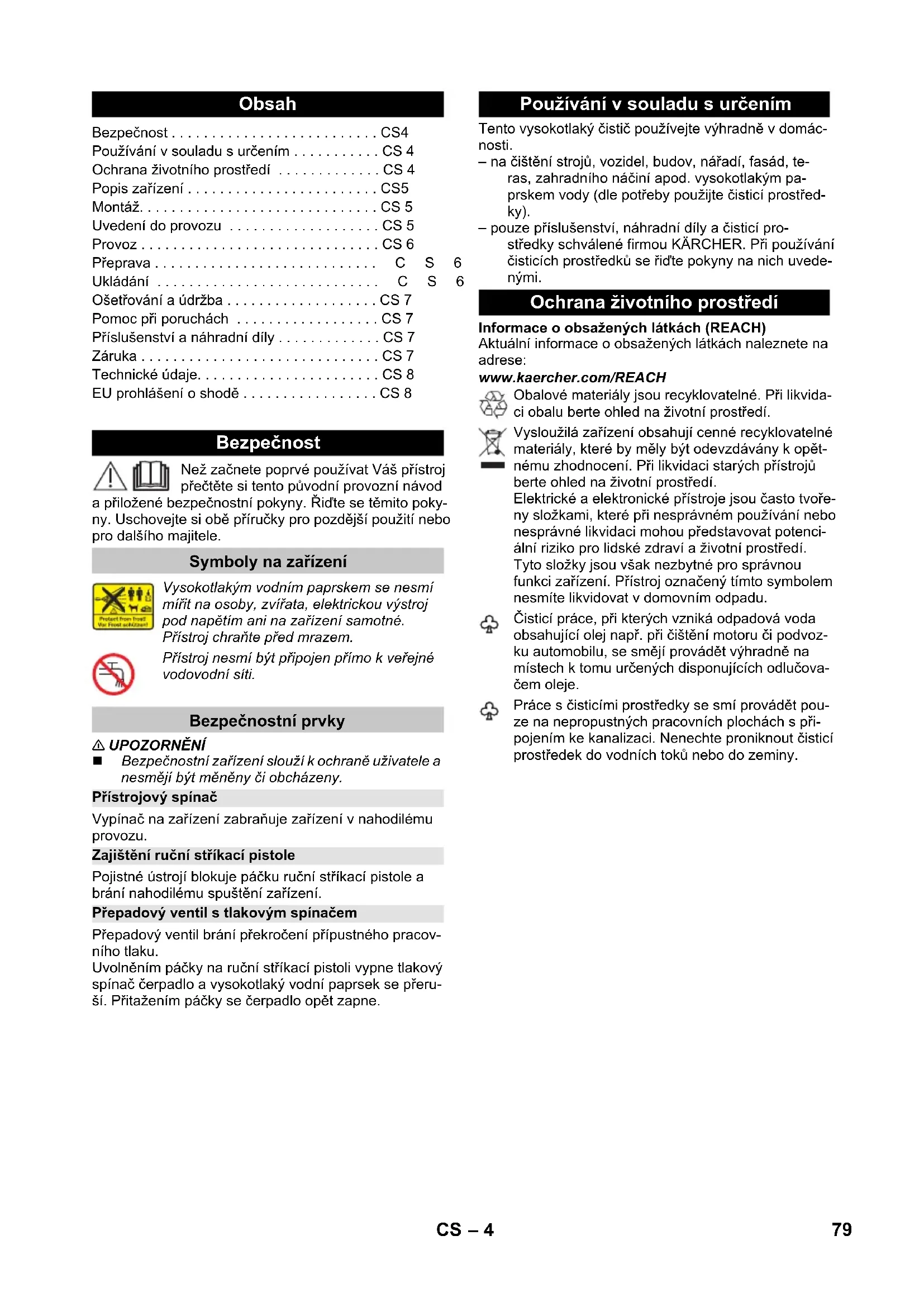 89 dB(A) Műszaki változtatások joga fenntartva. EU konformitási nyilatkozat Termék: Nagynyomású tisztító Típus: KHP 4 Vonatkozó európai közösségi irányelvek: 2000/14/EK 2014/30/EU 2006/42/EK (+2009/127/EK) 2011/65/ЕU Alkalmazott harmonizált szabványok: EN 50581 EN 55014–1:2017 EN 55014–2: 2015 EN 60335–1 EN 60335–2–79 EN 61000–3–2: 2014 EN 61000–3–3: 2013 EN 62233: 2008 Követett megfelelés megállapítási eljárás: 2000/14/EK: V. függelék Hangteljesítményszint dB(A) Mért: 87 Garantált: 89 Winnenden, 2018/08/01 Chairman of the Board of Management Director Regulatory Affairs & Certification 78 HU– 4 Než začnete poprvé používat Váš přístroj přečtěte si tento původní provozní návod a přiložené bezpečnostní pokyny. Řiďte se těmito poky- ny. Uschovejte si obě příručky pro pozdější použití nebo pro dalšího majitele. 몇 UPOZORNĚNÍ Bezpečnostní zařízení slouží k ochraně uživatele a nesmějí být měněny či obcházeny. Vypínač na zařízení zabraňuje zařízení v nahodilému provozu. Pojistné ústrojí blokuje páčku ruční stříkací pistole a brání nahodilému spuštění zařízení. Přepadový ventil brání překročení přípustného pracov- ního tlaku. Uvolněním páčky na ruční stříkací pistoli vypne tlakový spínač čerpadlo a vysokotlaký vodní paprsek se přeru- ší. Přitažením páčky se čerpadlo opět zapne. Tento vysokotlaký čistič používejte výhradně v domác- nosti. – na čištění strojů, vozidel, budov, nářadí, fasád, te- ras, zahradního náčiní apod. vysokotlakým pa- prskem vody (dle potřeby použijte čisticí prostřed- ky). – pouze příslušenství, náhradní díly a čisticí pro- středky schválené firmou KÄRCHER. Při používání čisticích prostředků se řiďte pokyny na nich uvede- nými. Informace o obsažených látkách (REACH) Aktuální informace o obsažených látkách naleznete na adrese: www.kaercher.com/REACH Obsah Bezpečnost . . . . . . . . . . . . . . . . . . . . . . . . . . CS4 Používání v souladu s určením . . . . . . . . . . . CS 4 Ochrana životního prostředí . . . . . . . . . . . . . CS 4 Popis zařízení . . . . . . . . . . . . . . . . . . . . . . . . CS5 Montáž. . . . . . . . . . . . . . . . . . . . . . . . . . . . . . CS 5 Uvedení do provozu . . . . . . . . . . . . . . . . . . . CS 5 Provoz . . . . . . . . . . . . . . . . . . . . . . . . . . . . . . CS 6 Přeprava . . . . . . . . . . . . . . . . . . . . . . . . . . . .CS6 Ukládání . . . . . . . . . . . . . . . . . . . . . . . . . . . .CS6 Ošetřování a údržba . . . . . . . . . . . . . . . . . . . CS 7 Pomoc při poruchách . . . . . . . . . . . . . . . . . . CS 7 Příslušenství a náhradní díly . . . . . . . . . . . . . CS 7 Záruka . . . . . . . . . . . . . . . . . . . . . . . . . . . . . . CS 7 Technické údaje. . . . . . . . . . . . . . . . . . . . . . . CS 8 EU prohlášení o shodě . . . . . . . . . . . . . . . . . CS 8 Bezpečnost Symboly na zařízení Vysokotlakým vodním paprskem se nesmí mířit na osoby, zvířata, elektrickou výstroj pod napětím ani na zařízení samotné. Přístroj chraňte před mrazem. Přístroj nesmí být připojen přímo k veřejné vodovodní síti. Bezpečnostní prvky Přístrojový spínač Zajištění ruční stříkací pistole Přepadový ventil s tlakovým spínačem Používání v souladu s určením Ochrana životního prostředí Obalové materiály jsou recyklovatelné. Při likvida- ci obalu berte ohled na životní prostředí. Vysloužilá zařízení obsahují cenné recyklovatelné materiály, které by měly být odevzdávány k opět- nému zhodnocení. Při likvidaci starých přístrojů berte ohled na životní prostředí. Elektrické a elektronické přístroje jsou často tvoře- ny složkami, které při nesprávném používání nebo nesprávné likvidaci mohou představovat potenci- ální riziko pro lidské zdraví a životní prostředí. Tyto složky jsou však nezbytné pro správnou funkci zařízení. Přístroj označený tímto symbolem nesmíte likvidovat v domovním odpadu. Čisticí práce, při kterých vzniká odpadová voda obsahující olej např. při čištění motoru či podvoz- ku automobilu, se smějí provádět výhradně na místech k tomu určených disponujících odlučova- čem oleje. Práce s čisticími prostředky se smí provádět pou- ze na nepropustných pracovních plochách s při- pojením ke kanalizaci. Nenechte proniknout čisticí prostředek do vodních toků nebo do zeminy. 79CS– 5 Objem dodávky přístroje (v závislosti na modelu) je vy- obrazen na obalu. Tento návod k použití popisuje veš- keré možné volitelné příslušenství. Ilustrace viz stránka 2 1 Spojovací element pro přívod vody 2 Vodní přípojka s integrovaným sítkem 3 Vypínač na přístroji "0/OFF" / "I/ON" 4 Vysokotlaká hadice 5 Buben na vysokotlaké hadice 6 Uložení pro ruční stříkací pistoli 7 Přepravní držadlo 8 Ruční klika na hadicový buben 9 Síť pro přihrádku na příslušenství 10 Síťové napájecí vedení se zástrčkou 11 Zásobník na čisticí prostředek 12 Přepravní kolo 13 Ruční stříkací pistole 14 Zajištění ruční stříkací pistole 15 Tlačítko k oddělení vysokotlaké hadice od ruční stříkací pistole 16 Vysokotlaká trubka s frézou na nečistoty Pro těžká znečištění 17 Používejte ocelovou trubku s regulací tlaku (Vario Power) Pro obvyklé čištění Pracovní tlak lze plynule zvyšovat od „SOFT“ do „HARD“. Pro přestavení pracovního tlaku uvolněte páčku vysokotlaké pistole a pracovní nástavec otočte do požadované polohy. Hodí se pro práci s čisticími prostředky. Před uvedením do provozu namontujte díly volně přilo- žené k zařízení. Ilustrace viz stránka 3 Ilustrace Zatlačte kola do úchytů. Zajistěte kola pomo