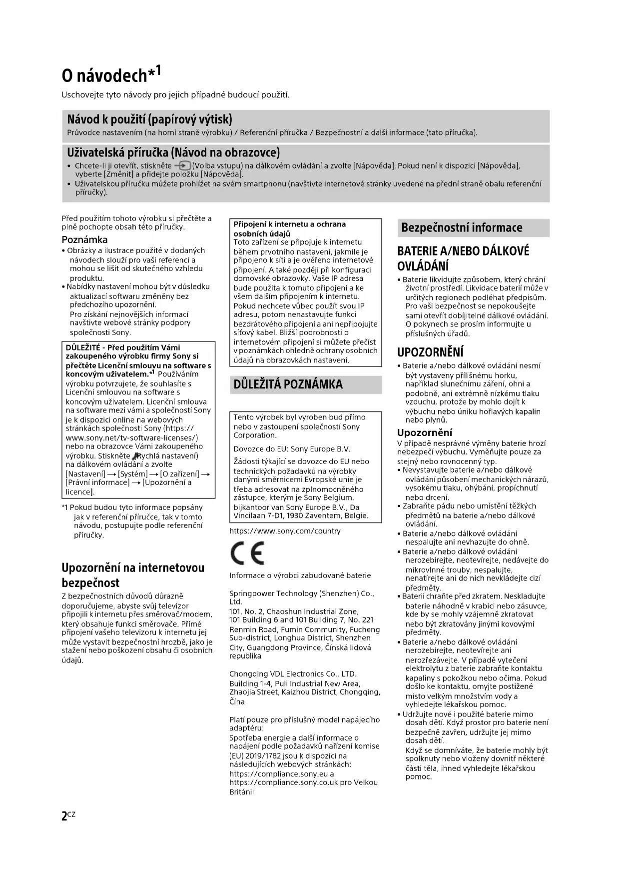 - Obrázky a ilustrace použité v dodaných návodech slouží pro vaši referenci a mohou se lišit od skutečného vzhledu produktu.• Nabídky nastavení mohou být v důsledku aktualizací softwaru změněny bez předchozího upozornění.Pro získání nejnovějších informací navštivte webové stránky podpory společnosti Sony. Upozornění na internetovou bezpečnost Z bezpečnostních důvodů důrazně doporučujeme, abyste svůj televizor připojili k internetu přes směrovač/modem, který obsahuje funkci směrovače. Přímé připojení vašeho televizoru k internetu jej může vystavit bezpečnostní hrozbě, jako je stažení nebo poškození obsahu či osobních údajů.https://www.sony.com/countryInformace o výrobci zabudované baterieSpringpower Technology (Shenzhen) Co., Ltd. 101, No. 2, Chaoshun Industrial Zone, 101 Building 6 and 101 Building 7, No. 221 Renmin Road, Fumin Community, Fucheng Sub-district, Longhua District, Shenzhen City, Guangdong Province, Čínská lidová republika Chongqing VDL Electronics Co., LTD.Building 1-4, Puli Industrial New Area, Zhaojia Street, Kaizhou District, Chongqing, Čína Platí pouze pro příslušný model napájecího adaptéru:Spotřeba energie a další informace o napájení podle požadavků nařízení komise (EU) 2019/1782 jsou k dispozici na následujících webových stránkách:https://compliance.sony.eu ahttps://compliance.sony.co.uk pro Velkou Británii
