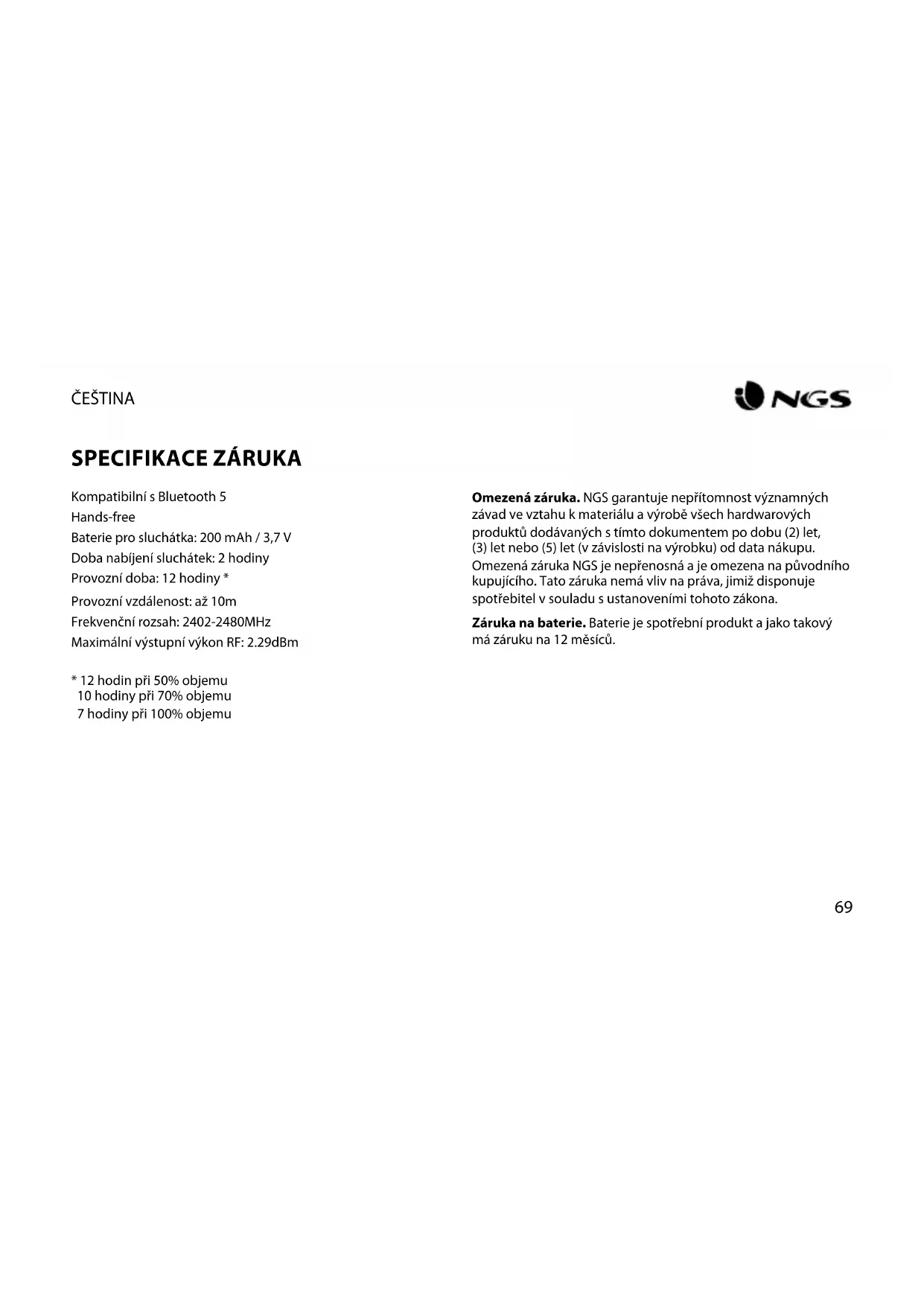 Omezená záruka. NGS garantuje nepřítomnost významných závad ve vztahu k materiálu a výrobě všech hardwarových produktů dodávaných s tímto dokumentem po dobu (2) let, (3) let nebo (5) let (v závislosti na výrobku) od data nákupu. Omezená záruka NGS je nepřenosná a je omezena na původního kupujícího. Tato záruka nemá vliv na práva, jimiž disponuje spotřebitel v souladu s ustanoveními tohoto zákona. Záruka na baterie. Baterie je spotřební produkt a jako takový má záruku na 12 měsíců. Kompatibilní s Bluetooth 5 Hands-free Baterie pro sluchátka: 200 mAh / 3,7 V Doba nabíjení sluchátek: 2 hodiny Provozní doba: 12 hodiny * Provozní vzdálenost: až 10m Frekvenční rozsah: 2402-2480MHz Maximální výstupní výkon RF: 2.29dBm