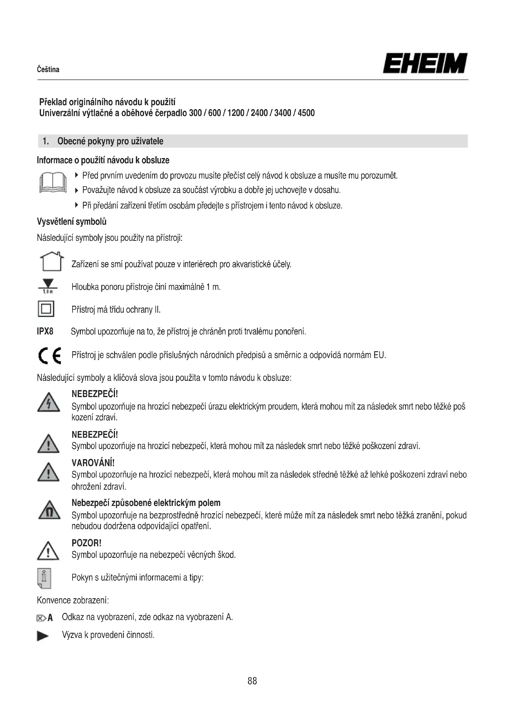 Zařízení se smí používat pouze v interiérech pro akvaristické účely. Hloubka ponoru přístroje činí maximálně 1 m. Přístroj má třídu ochrany II. IPX8 Symbol upozorňuje na to, že přístroj je chráněn proti trvalému ponoření. Přístroj je schválen podle příslušnych národních předpisů a směrnic a odpovídá normám EU. Následující symboly a klíčová slova jsou použita v tomto návodu k obsluze: NEBEZPEČÍ! Symbol upozorňuje na hrozící nebezpečí úrazu elektrickym proudem, která mohou mít za následek smrt nebo těžké poš kození zdraví. NEBEZPEČÍ! Symbol upozorňuje na hrozící nebezpečí, která mohou mít za následek smrt nebo těžké poškození zdraví. VAROVÁNÍ! Symbol upozorňuje na hrozící nebezpečí, která mohou mít za následek středně těžké až lehké poškození zdraví nebo ohrožení zdraví. Nebezpečí způsobené elektrickym polem Symbol upozorňuje na bezprostředně hrozící nebezpečí, které může mít za následek smrt nebo těžká zranění, pokud nebudou dodržena odpovídající opatření. POZOR! Symbol upozorňuje na nebezpečí věcnych škod. Pokyn s užitečnymi informacemi a tipy: Konvence zobrazení: