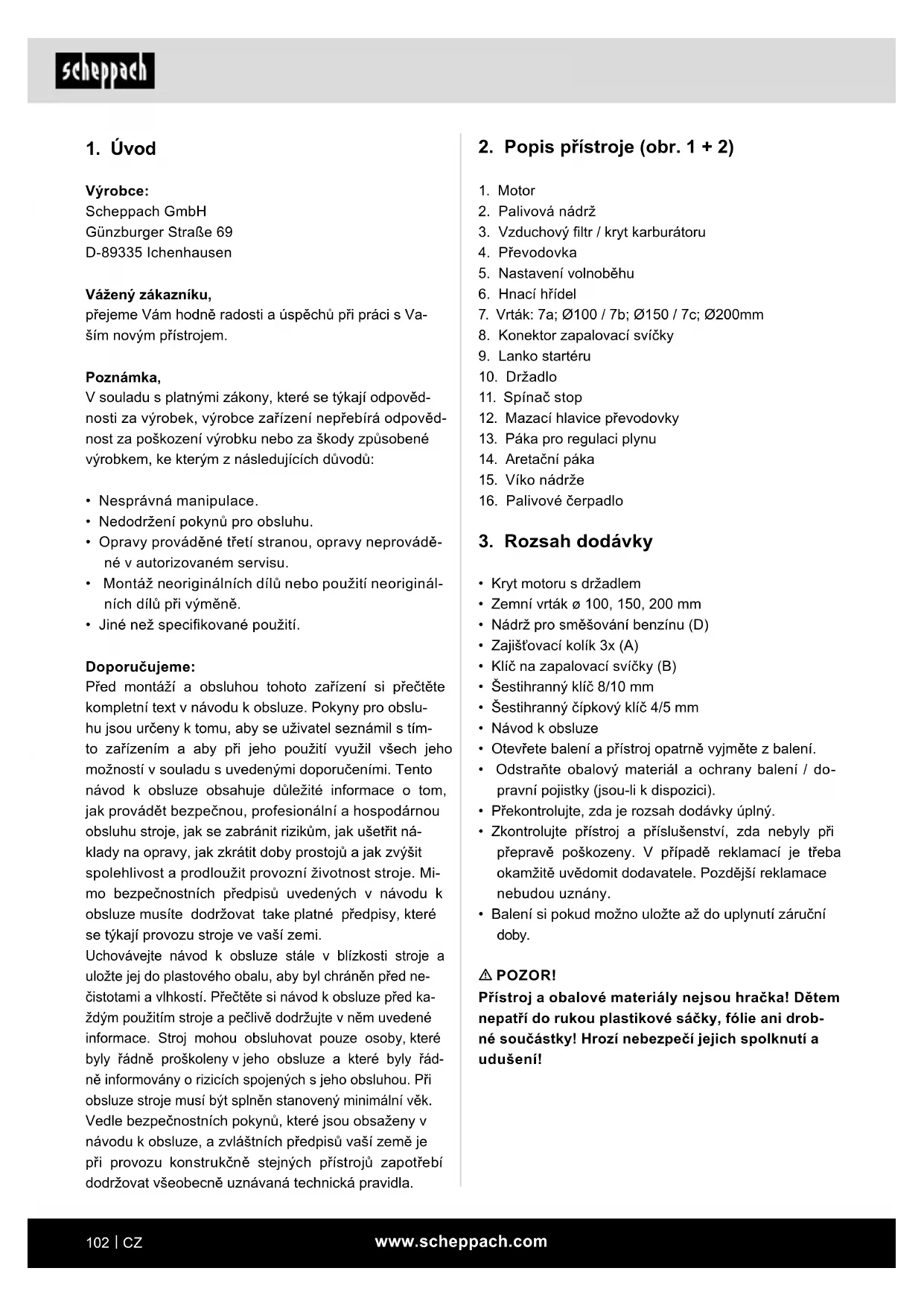 Výrobce: Scheppach GmbH Günzburger Straße 69 D-89335 Ichenhausen Vážený zákazníku, přejeme Vám hodně radosti a úspěchů při práci s Va- ším novým přístrojem. Poznámka, V souladu s platnými zákony, které se týkají odpověd- nosti za výrobek, výrobce zařízení nepřebírá odpověd- nost za poškození výrobku nebo za škody způsobené výrobkem, ke kterým z následujících důvodů: