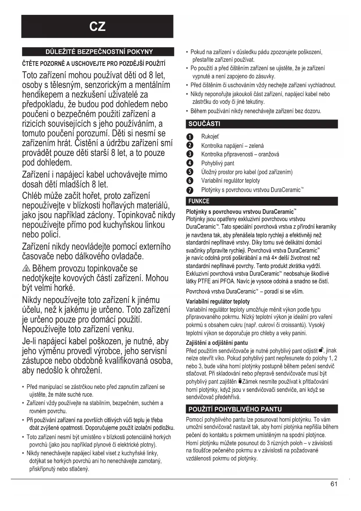 ČTĚTE POZORNĚ A USCHOVEJTE PRO POZDĚJŠÍ POUŽITÍ Toto zařízení mohou používat děti od 8 let, osoby s tělesným, senzorickým a mentálním hendikepem a nezkušení uživatelé za předpokladu, že budou pod dohledem nebo poučeni o bezpečném použití zařízení a rizicích souvisejících s jeho používáním, a tomuto poučení porozumí. Děti si nesmí se zařízením hrát. Čistění a údržbu zařízení smí provádět pouze děti starší 8 let, a to pouze pod dohledem. Zařízení i napájecí kabel uchovávejte mimo dosah dětí mladších 8 let. Chléb může začít hořet, proto zařízení nepoužívejte v blízkosti hořlavých materiálů, jako jsou například záclony. Topinkovač nikdy nepoužívejte přímo pod kuchyňskou linkou nebo policí. Zařízení nikdy neovládejte pomocí externího časovače nebo dálkového ovladače. Během provozu topinkovače se nedotýkejte kovových částí zařízení. Mohou být velmi horké. Nikdy nepoužívejte toto zařízení k jinému účelu, než k jakému je určeno. Toto zařízení je určeno pouze pro domácí použití. Nepoužívejte toto zařízení venku. Je-li napájecí kabel poškozen, je nutné, aby jeho výměnu provedl výrobce, jeho servisní zástupce nebo obdobně kvalikovaná osoba, aby nedošlo k ohrožení.