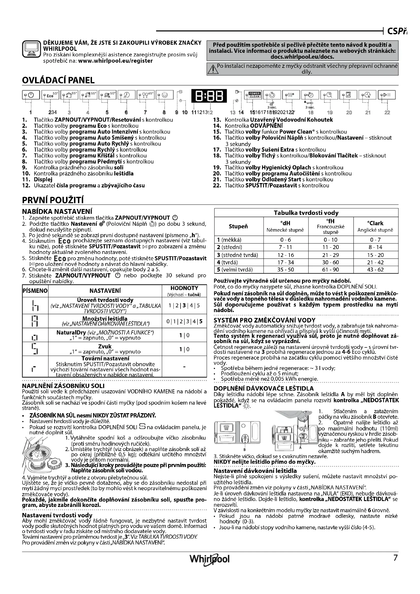 Před použitím spotřebiče si pečlivě přečtěte tento návod k použití a instalaci. Více informací o produktu naleznete na webových stránkách: docs.whirlpool.eu/docs. Po instalaci nezapomeňte z myčky odstranit všechny přepravní ochranné díly.