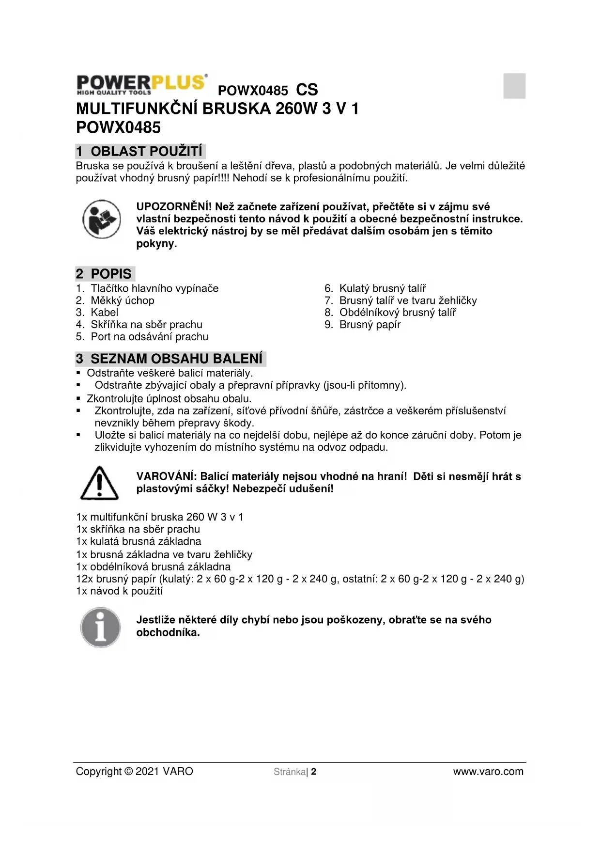 - VARO N.V. - Vic. Van Rompuy N.V. – Joseph Van Instraat 9 - BE2500 Lier - BELGIUM, prohlašuje, že Výrobek: MULTIFUNKČNÍ BRUSKA 260W 3 v 1 Výrobní značka: POWERplus Model: POWX0485 je ve shodě se základními požadavky a ostatními relevantními ustanoveními příslušných evropských směrnic založených na aplikaci evropských harmonizovaných norem. Jakákoliv neschválená úprava přístroje vede ke ztrátě platnosti tohoto prohlášení. Evropské směrnice (včetně, nastanou-li, jejich změn a doplňků až do data podpisu): 2011/65/EU 2006/42/EC 2014/30/EU Evropské harmonizované normy (včetně, nastanou-li, jejich změn a doplňků až do data podpisu): EN62841-1 : 2015 EN62841-2-4 : 2014 EN55014-1 : 2017 EN55014-2 : 2015 EN61000-3-2 : 2014 EN61000-3-3 : 2013 Držitel technické dokumentace: Philippe Vankerkhove, VARO - Vic. Van Rompuy N.V. Níže podepsaný jedná jménem vedení společnosti, Philippe Vankerkhove Regulativní postupy - Manažer pro dohled nad řádným jednáním 20/01/2021, Lier - BelgiumPOWX0485 SK Copyright © 2021 VARO S t r a n a | 1 www.varo.com 1 POUŽÍVANIE p. 2