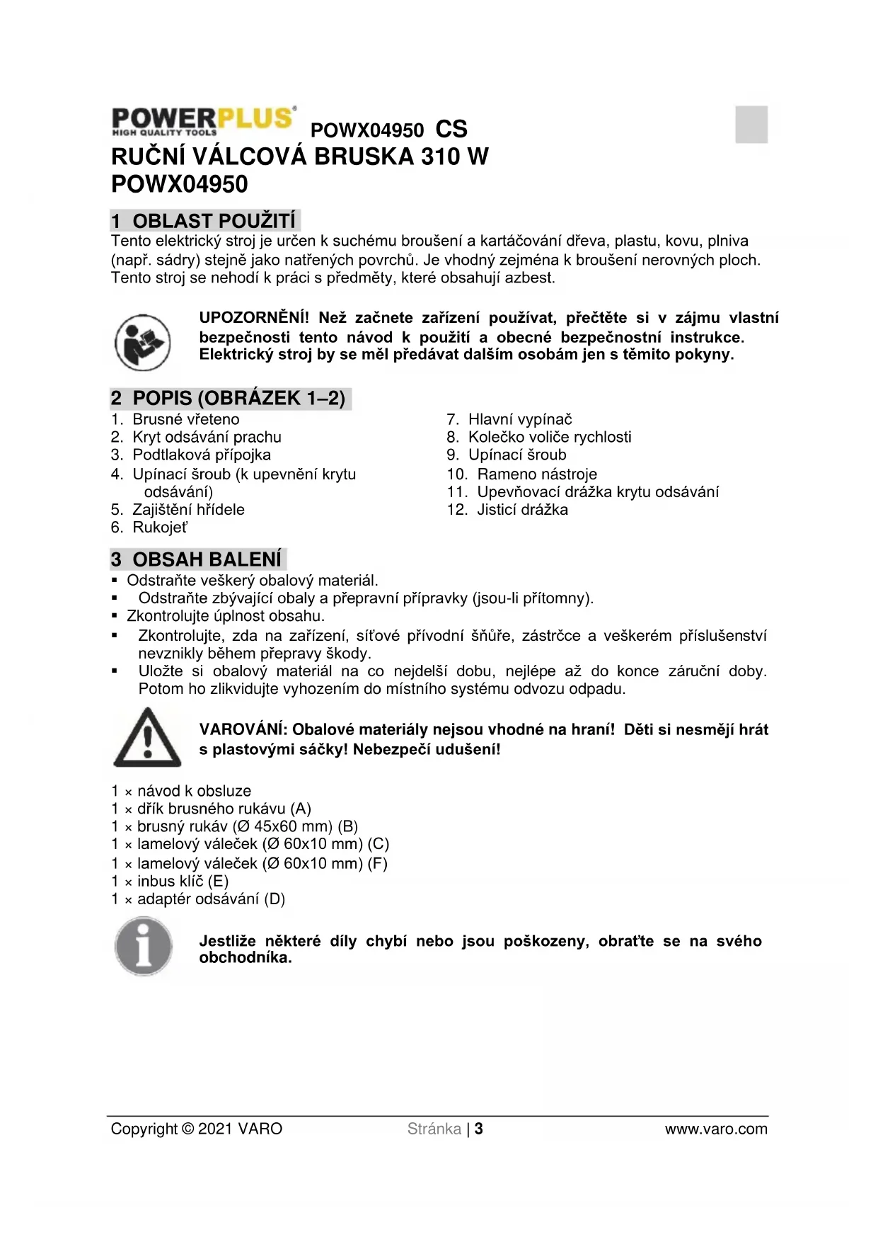 Servisní práce na elektrickém stroji přenechejte kvalifikovanému technikovi, který používá výhradně originální náhradní díly. Tak zajistíte, že stroj bude i nadále bezpečný. 6 BEZPEČNOSTNÍ POKYNY PRO RUČNÍ VÁLCOVÉ BRUSKY Zařízení držte za izolované úchopné plochy, neboť brusné pouzdro může narušit přívodní kabel nástroje. Poškození vodiče pod napětím může nabít kovové části zařízení a vést k zasažení elektrickým proudem.POWX04950 CS Copyright © 2021 VARO Stránka | 6 www.varo.com Nebezpečí požáru kvůli jiskrám! Broušením kovů vzniká jiskření. Dávejte tedy velký pozor, abyste neohrozili osoby a aby v blízkosti pracoviště nebyly hořlaviny. Při práci se dřevem a zejména při práci s materiálem, který může vytvářet škodlivý prach, připojte zařízení k vhodnému vnějšímu odsávání prachu. Zajistěte dostatečné větrání při práci s plasty, barvami, laky atd. Brusný kartáč je určen pro brusné plochy na dřevě, plastu, kovu a tmelu, jakož i lakované povrchy. Zařízení používejte pouze k broušení nasucho. Nepracujte s materiály, které obsahují azbest. Azbest je považován za karcinogenní. Varování! Toxický prach! Prach z materiálů, jakými jsou nátěry s obsahem olova, některé druhy dřeva, minerály a kovy, může být zdraví škodlivý. Dotknout se tohoto typu prachu nebo jej vdechnout představuje nebezpečí pro uživatele nebo blízko stojící osobu. Noste bezpečnostní brýle a protiprašný respirátor! Obrobek zajistěte. K upevnění obrobku používejte svorky nebo svěrák. Je to mnohem bezpečnější než držet obrobek v ruce. Nikdy nedávejte ruku vedle zařízení a opracovávaného povrchu ani před ně, neboť při sklouznutí hrozí riziko poranění. V případě nebezpečí ihned vytáhněte síťovou zástrčku ze zásuvky Napájecí kabel vždy veďte směrem od stroje a dozadu Vyhněte se kontaktu s brusným rukávem, který je v pohybu. Nezpracovávejte navlhčené materiály ani vlhké plochy. Zařízení přikládejte k opracovávané ploše jen když je zapnuté. Když je úkol dokončen, odeberte zařízení z obrobku a teprve pak je vypněte. Při práci vždy držte zařízení pevně oběma rukama. Ujistěte se, že máte pevný postoj. Vždy počkejte na úplné zastavení zařízení a před odložením je vypněte. Před přestávkou v práci vždy odpojte zařízení ze síťové zásuvky, zvláště když pracujete na zařízení samém (např. při výměně brusného papíru) nebo před odstávkou. 7 MONTÁŽ Varování! Nebezpečí úrazu! Před prací na brusném kartáči vždy odpojte zařízení od sítě.