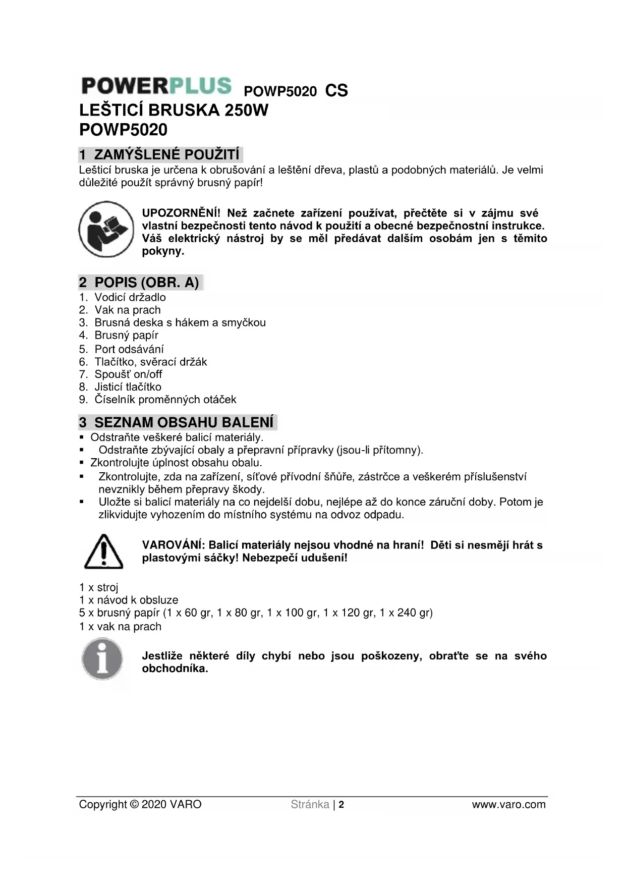 - Uložte si balicí materiály na co nejdelší dobu, nejlépe až do konce záruční doby. Potom je zlikvidujte vyhozením do místního systému na odvoz odpadu. VAROVÁNÍ: Balicí materiály nejsou vhodné na hraní! Děti si nesmějí hrát s plastovými sáčky! Nebezpečí udušení! 1 x stroj 1 x návod k obsluze 5 x brusný papír (1 x 60 gr, 1 x 80 gr, 1 x 100 gr, 1 x 120 gr, 1 x 240 gr) 1 x vak na prach Jestliže některé díly chybí nebo jsou poškozeny, obraťte se na svého obchodníka.POWP5020 CS Copyright © 2020 VARO Stránka | 3 www.varo.com 4 SYMBOLY V tomto návodu a na stroji jsou používány následující symboly: