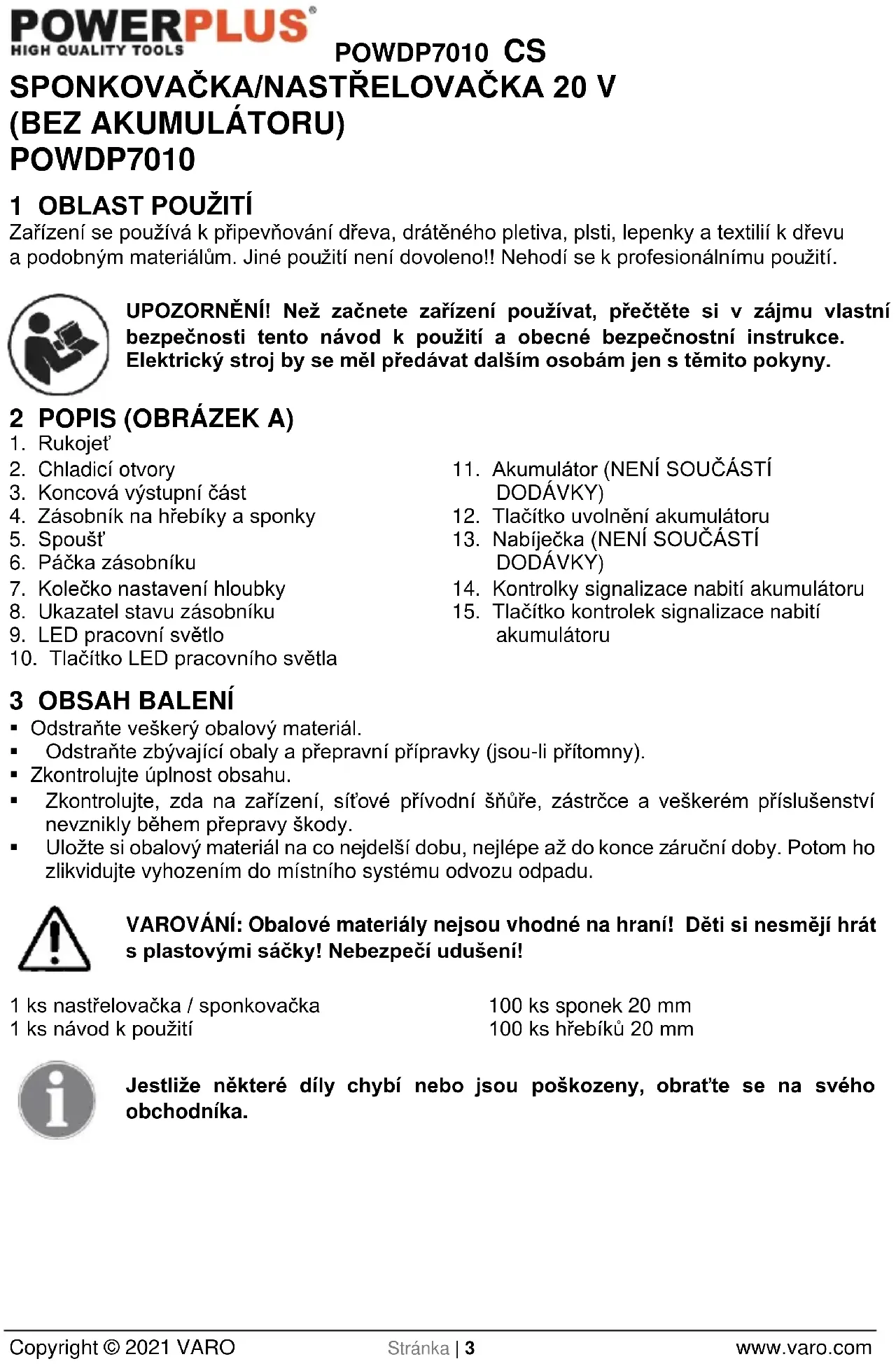 - Neukládejte jej v plastových pytlích, ve kterých by se hromadila vlhkost.POWDP7010 CS Copyright © 2021 VARO Stránka | 10 www.varo.com 15 ZÁRUKA