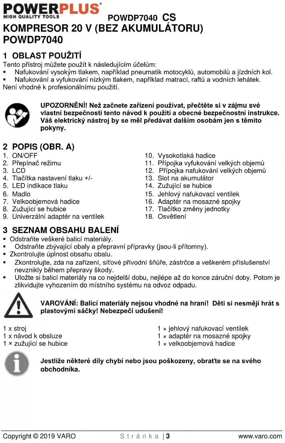 VARO N.V. - Joseph Van Instraat 9 - BE2500 Lier - BELGIUM, prohlašuje, že Výrobek: KOMPRESOR 20 V Výrobní značka: POWERplus Model: POWDP7040 je ve shodě se základními požadavky a ostatními relevantními ustanoveními příslušných evropských směrnic založených na aplikaci evropských harmonizovaných norem. Jakákoliv neschválená úprava přístroje vede ke ztrátě platnosti tohoto prohlášení. Evropské směrnice (včetně, nastanou-li, jejich změn a doplňků až do data podpisu): 2011/65/EU 2014/30/EU 2006/42/EC Evropské harmonizované normy (včetně, nastanou-li, jejich změn a doplňků až do data podpisu): EN 60204-1:2006 EN 1012-1:2010 EN 60335-1:2012 EN55014-1 : 2017 EN55014-2 : 2015 EN61000-3-2 : 2014 EN61000-3-3 : 2013 Držitel technické dokumentace: Philippe Vankerkhove, VARO - Vic. Van Rompuy N.V. Níže podepsaný jedná jménem vedení společnosti, Hugo Cuypers Certification Manager Lier, 04/01/2019POWDP7040 SK Copyright © 2019 VARO Strana | 1 www.varo.com 1 POUŽÍVANIE ................................................................................... 3