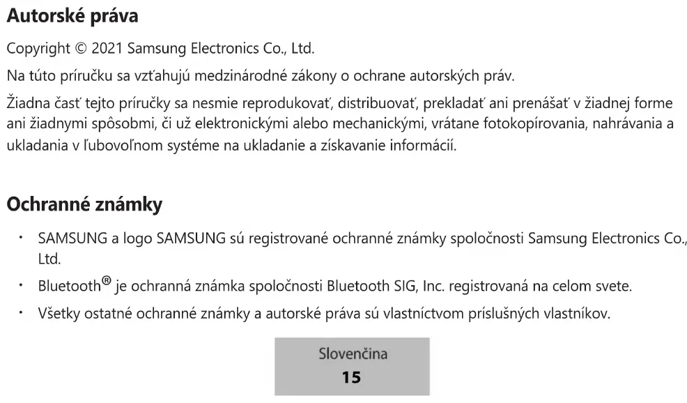 Společnost Samsung nenese zodpovědnost za případné škody nebo ztráty (na základě smlouvy nebo občanskoprávního deliktu včetně nedbalosti), které by mohly pramenit z nedodržování přesného znění těchto varování a pokynů, kromě úmrtí nebo poranění osob způsobených nedbalostí společnosti Samsung. Čeština 14Copyright Copyright © 2021 Samsung Electronics Co., Ltd. Tato příručka je chráněna mezinárodními zákony o autorských právech. Jakoukoliv část této příručky je zakázáno reprodukovat, šířit, překládat nebo předávat jakoukoliv formou nebo způsobem, elektronicky či mechanicky, včetně fotokopií, natáčení ani pomocí jiných systémů pro ukládání. Ochranné známky
