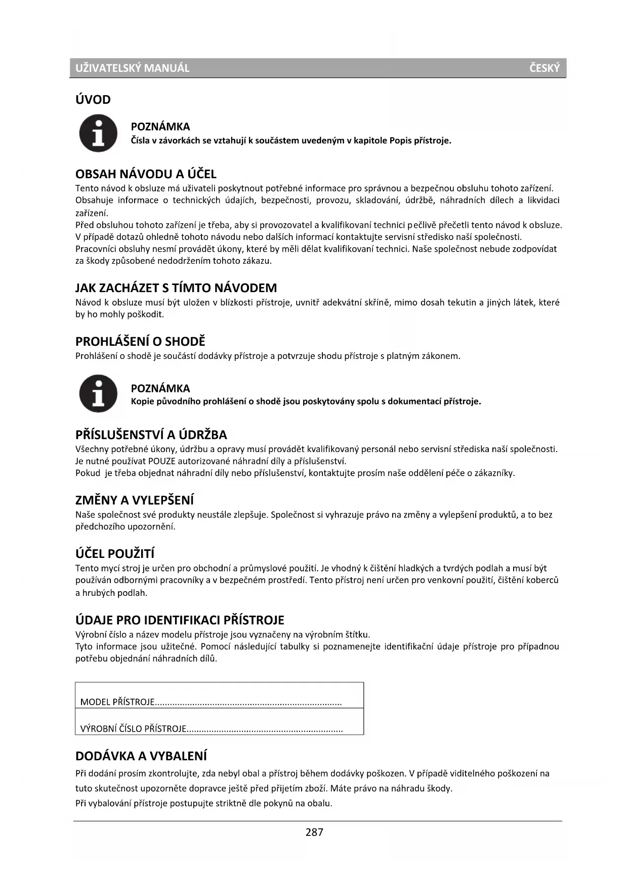 Tento mycí stroj je určen pro obchodní a průmyslové použití. Je vhodný k čištění hladkých a tvrdých podlah a musí být používán odbornými pracovníky a v bezpečném prostředí. Tento přístroj není určen pro venkovní použití, čištění koberců a hrubých podlah.