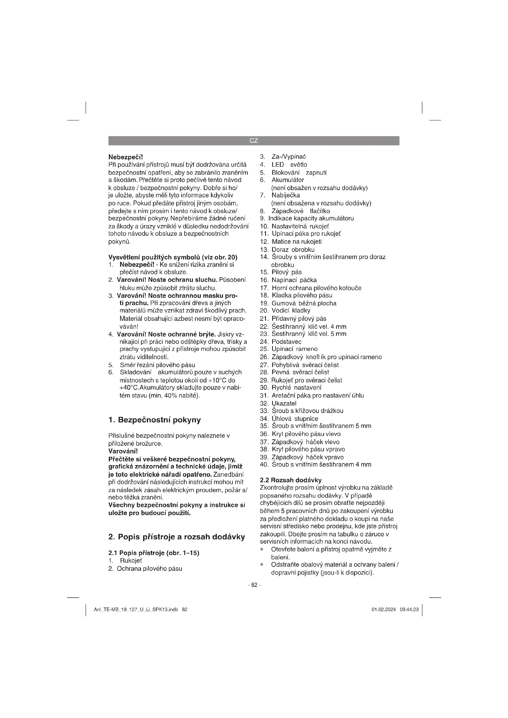 Než stisknete za-/vypínač, ujistěte se, že je pilový pás správně namontovaný, a zkontro- Anl_TE-MB_18_127_U_Li_SPK13.indb 84Anl_TE-MB_18_127_U_Li_SPK13.indb 84 01.02.2024 09:44:2301.02.2024 09:44:23CZ