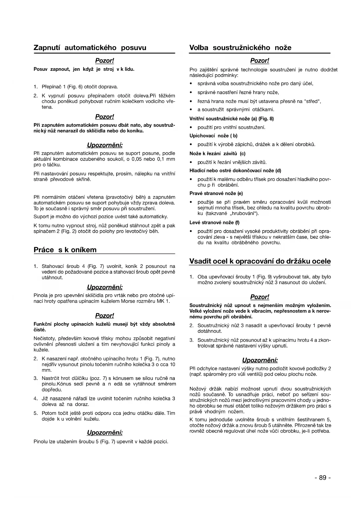 dojde kuvolnění kuželu. Upozornění: Pinolu lzeutažením šroubu 5(Fig.7)upevnit vkaždé pozici. Volba soustružnického nože Pozor! Pro zajištění správné technologie soustružení je nutno dodržet následující podmínky: