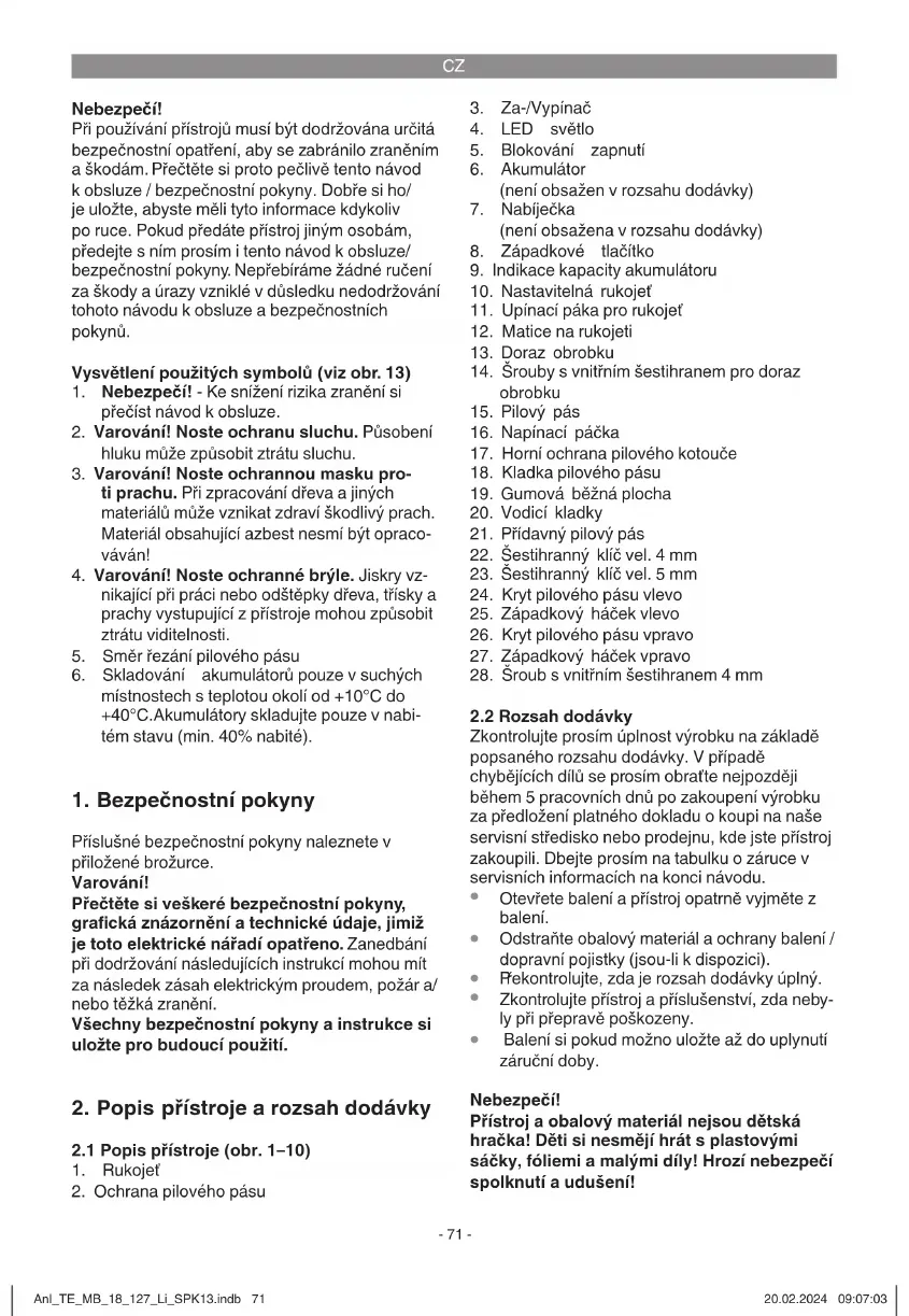 Balení si pokud možno uložte až do uplynutí záruční doby. Nebezpečí! Přístroj a obalový materiál nejsou dětská hračka! Děti si nesmějí hrát s plastovými sáčky, fóliemi a malými díly! Hrozí nebezpečí spolknutí a udušení! Anl_TE_MB_18_127_Li_SPK13.indb 71Anl_TE_MB_18_127_Li_SPK13.indb 71 20.02.2024 09:07:0320.02.2024 09:07:03CZ