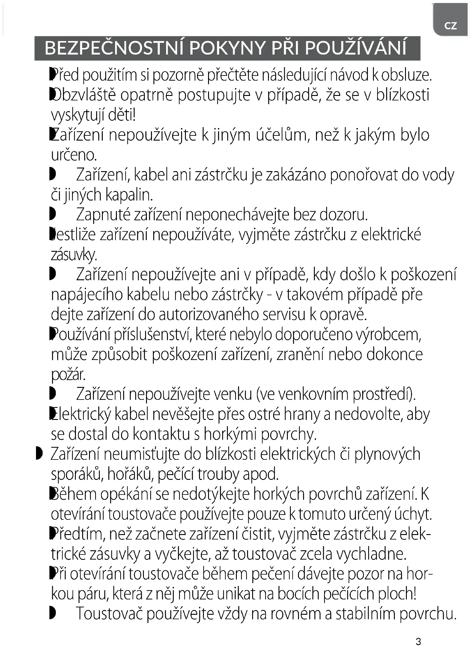 Při otevírání toustovače během pečení dávejte pozor na hor- kou páru, která z něj může unikat na bocích pečících ploch! Toustovač používejte vždy na rovném a stabilním povrchu.4 C Z Zařízení musí být připojeno do elektrické zásuvky se zem- nícím kolíkem!