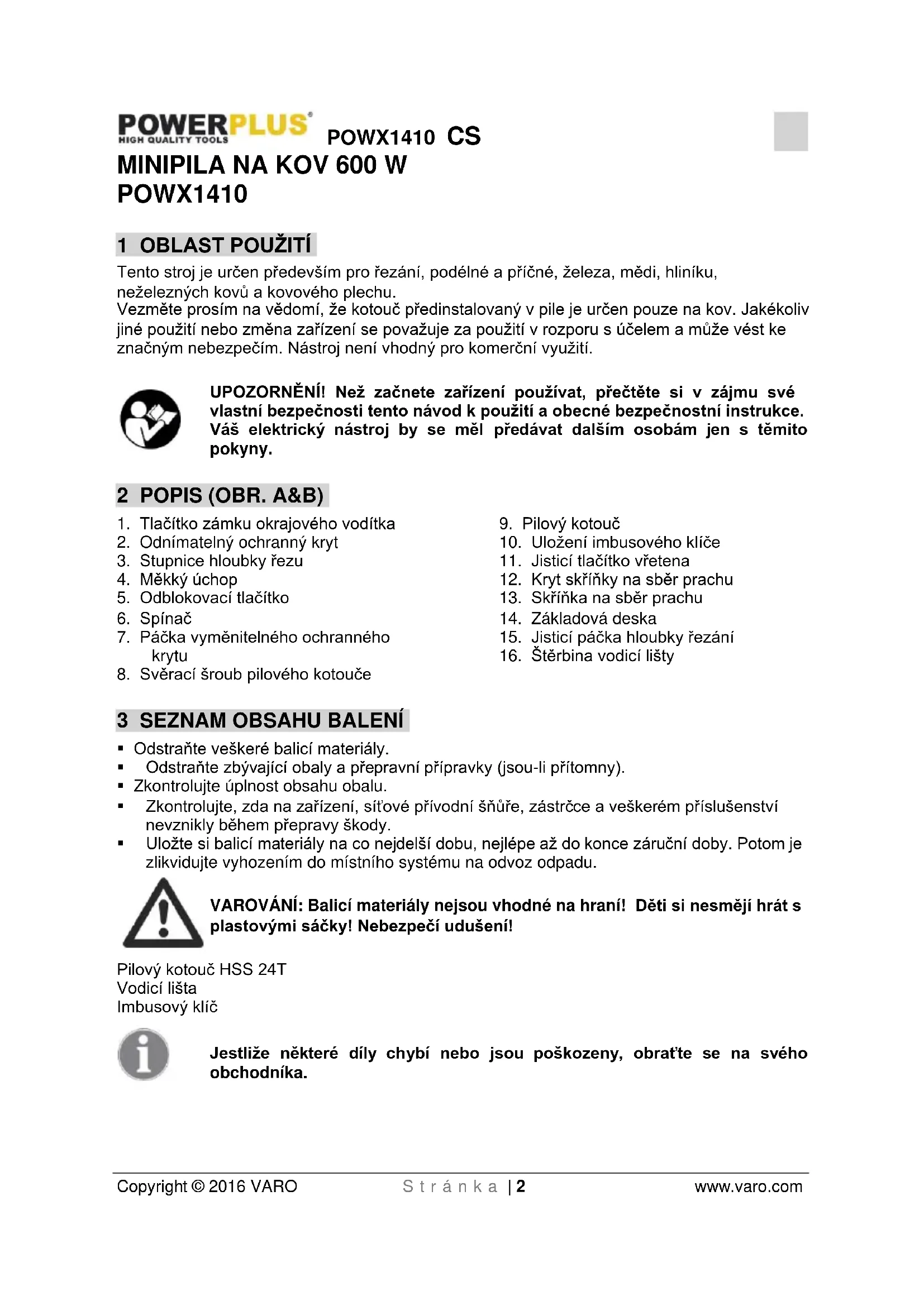 VARO N.V. - Joseph Van Instraat 9 - BE2500 Lier - BELGIUM, prohlašuje, že Výrobek: Minipila na kov 600 W Výrobní značka: POWERplus Model: POWX1410 je ve shodě se základními požadavky a ostatními relevantními ustanoveními příslušných evropských směrnic založených na aplikaci evropských harmonizovaných norem. Jakákoliv neschválená úprava přístroje vede ke ztrátě platnosti tohoto prohlášení. Evropské směrnice (včetně, nastanou-li, jejich změn a doplňků až do data podpisu): 2011/65/EU 2006/42/EC 2014/30/EU Evropské harmonizované normy (včetně, nastanou-li, jejich změn a doplňků až do data podpisu): EN60745-1 : 2009 EN60745-2-5 : 2010 EN55014-1 : 2006 EN55014-2 : 1997 EN61000-3-2 : 2014 EN61000-3-3 : 2013 Držitel technické dokumentace: Philippe Vankerkhove, VARO - Vic. Van Rompuy N.V. Níže podepsaný jedná jménem vedení společnosti, Philippe Vankerkhove Regulativní postupy - Manažer pro dohled nad řádným jednáním 28/04/2016POWX1410 SK Copyright © 2016 VARO S t r a n a | 1 www.varo.com 1 POUŽÍVANIE ...................................................................................... 2