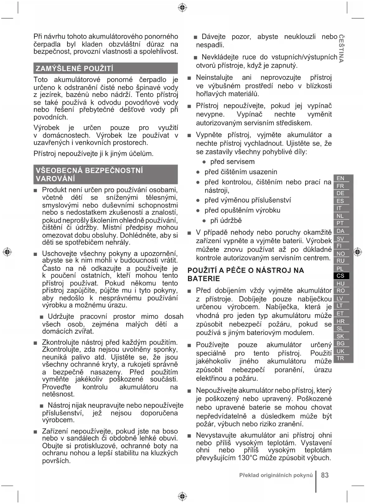 VAROVÁNÍ ■ Produkt není určen pro používání osobami, včetně dětí se sníženými tělesnými, smyslovými nebo duševními schopnostmi nebo s nedostatkem zkušeností a znalostí, pokud neprošly školením ohledně používání, čištění či údržby. Místní předpisy mohou omezovat dobu obsluhy. Dohlédněte, aby si děti se spotřebičem nehrály. ■ Uschovejte všechny pokyny a upozornění, abyste se k nim mohli v budoucnosti vrátit. Často na ně odkazujte a používejte je k poučení ostatních, kteří mohou tento přístroj používat. Pokud někomu tento přístroj zapůjčíte, půjčte mu i tyto pokyny, aby nedošlo k nesprávnému používání výrobku a možnému úrazu. ■ Udržujte pracovní prostor mimo dosah všech osob, zejména malých dětí a domácích zvířat. ■ Zkontrolujte nástroj před každým použitím. Zkontrolujte, zda nejsou uvolněny sponky, neuniká palivo atd. Ujistěte se, že jsou všechny ochranné kryty, a rukojeti správně a bezpečně nasazeny. Před použitím vyměňte jakékoliv poškozené součásti. Proveďte kontrolu akumulátoru na netěsnost. ■ Nástroj nijak neupravujte nebo nepoužívejte příslušenství, jež nejsou doporučena výrobcem. ■ Zařízení nepoužívejte, pokud jste na boso nebo v sandálech či obdobně lehké obuvi. Obujte si protiskluzové, ochranné boty na ochranu nohou a lepší stabilitu na kluzkých površích. ■ Dávejte pozor, abyste neuklouzli nebo nespadli. ■ Nevkládejte ruce do vstupních/výstupních otvorů přístroje, když je zapnutý. ■ Neinstalujte ani neprovozujte přístroj ve výbušném prostředí nebo v blízkosti hořlavých materiálů. ■ Přístroj nepoužívejte, pokud jej vypínač nevypne. Vypínač nechte vyměnit autorizovaným servisním střediskem. ■ Vypněte přístroj, vyjměte akumulátor a nechte přístroj vychladnout. Ujistěte se, že se zastavily všechny pohyblivé díly: ● před servisem ● před čištěním usazenin ● před kontrolou, čištěním nebo prací na nástroji, ● před výměnou příslušenství ● před opuštěním výrobku ● při údržbě ■ V případě nehody nebo poruchy okamžitě zařízení vypněte a vyjměte baterii. Výrobek můžete znovu používat až po důkladné kontrole autorizovaným servisním centrem. POUŽITÍ A PÉČE O NÁSTROJ NA BATERIE ■ Před dobíjením vždy vyjměte akumulátor z přístroje. Dobíjejte pouze nabíječkou určenou výrobcem. Nabíječka, která je vhodná pro jeden typ akumulátoru může způsobit nebezpečí požáru, pokud se používá s jiným bateriovým modulem. ■ Používejte pouze akumulátor určený speciálně pro tento přístroj. Použití jakéhokoliv jiného akumulátoru může způsobit nebezpečí poranění, úrazu elektřinou a požáru. ■ Nepoužívejte akumulátor nebo přístroj, který je poškozený nebo upravený. Poškozené nebo upravené baterie se mohou chovat nepředvídatelně a důsledkem může být požár, výbuch nebo riziko zranění. ■ Nevystavujte akumulátor ani přístroj ohni nebo příliš vysokým teplotám. Vystavení ohni nebo příliš vysokým teplotám převyšujícím 130°C může způsobit výbuch.84 Překlad originálních pokynů ■ Pokud akumulátor nepoužíváte, uchovávejte jej mimo kovové předměty jako svorky pro papír, mince, klíče, hřebíky, šrouby nebo jiné malé kovové předměty, které mohou vytvořit propojení jednoho vývodu s druhým. Zkratování vývodů baterie může způsobit požár nebo popáleniny. ■ Při špatném použití může dojít k vystříknutí tekutiny z baterie. Nedotýkat se. Pokud dojde k náhodnému kontaktu, omyjte vodou. Pokud kapalina přijde do kontaktu s očima, ihned vyhledejte lékařskou pomoc. Kapalina vytečená z baterie způsobit podráždění nebo popáleniny. ■ Vyčerpaný akumulátor vyjměte z produktu a bezpečně jej zlikvidujte.