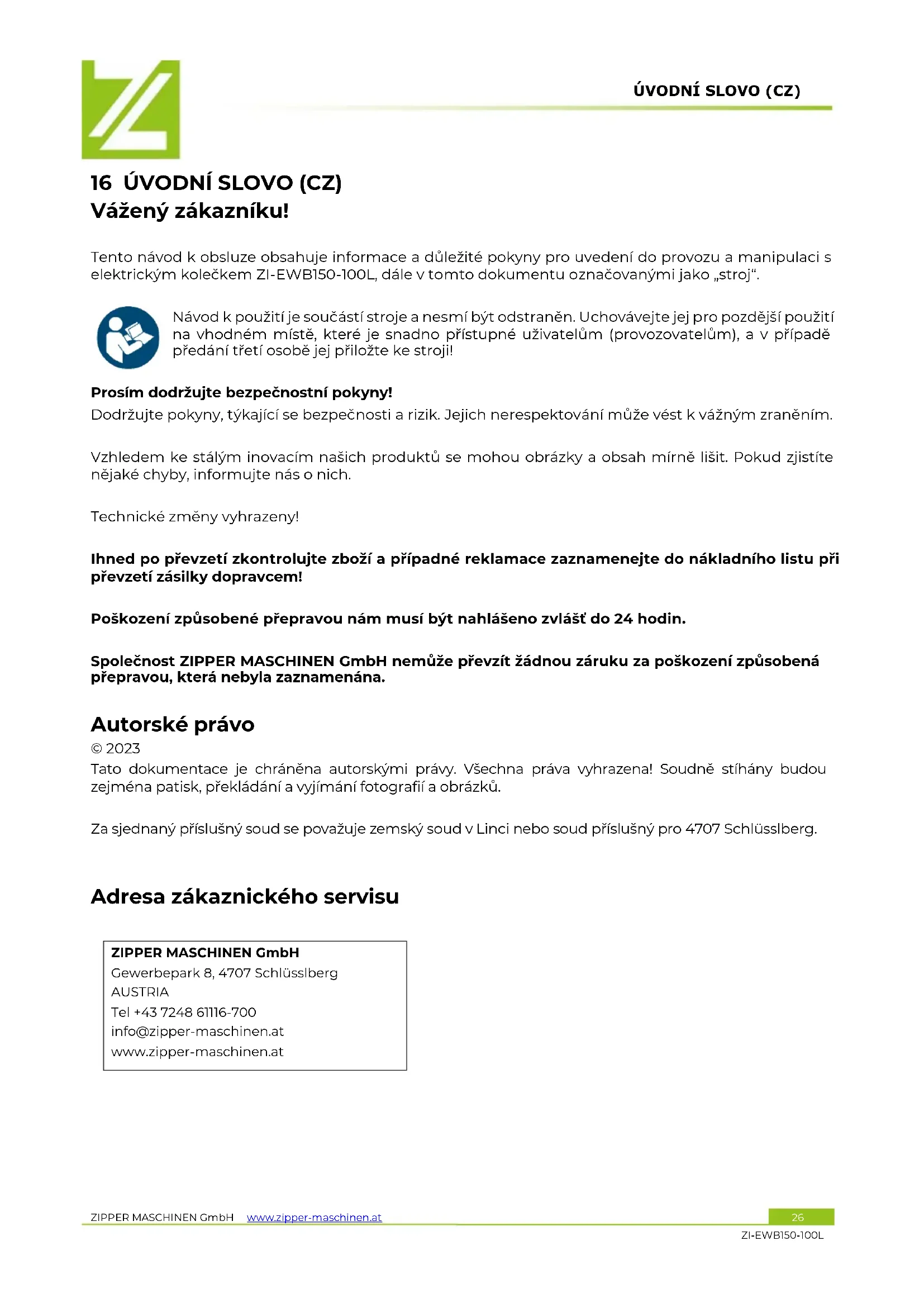 16 ÚVODNÍ SLOVO (CZ) Vážený zákazníku! Tento návod k obsluze obsahuje informace a důležité pokyny pro uvedení do provozu a manipulaci s elektrickým kolečkem ZI-EWB150-100L, dále v tomto dokumentu označovanými jako „stroj“. Návod k použití je součástí stroje a nesmí být odstraněn. Uchovávejte jej pro pozdější použití na vhodném místě, které je snadno přístupné uživatelům (provozovatelům), a v případě předání třetí osobě jej přiložte ke stroji! Prosím dodržujte bezpečnostní pokyny! Dodržujte pokyny, týkající se bezpečnosti a rizik. Jejich nerespektování může vést k vážným zraněním. Vzhledem ke stálým inovacím našich produktů se mohou obrázky a obsah mírně lišit. Pokud zjistíte nějaké chyby, informujte nás o nich. Technické změny vyhrazeny! Ihned po převzetí zkontrolujte zboží a případné reklamace zaznamenejte do nákladního listu při převzetí zásilky dopravcem! Poškození způsobené přepravou nám musí být nahlášeno zvlášť do 24 hodin. Společnost ZIPPER MASCHINEN GmbH nemůže převzít žádnou záruku za poškození způsobená přepravou, která nebyla zaznamenána. Autorské právo © 2023 Tato dokumentace je chráněna autorskými právy. Všechna práva vyhrazena! Soudně stíhány budou zejména patisk, překládání a vyjímání fotografií a obrázků. Za sjednaný příslušný soud se považuje zemský soud v Linci nebo soud příslušný pro 4707 Schlüsslberg.