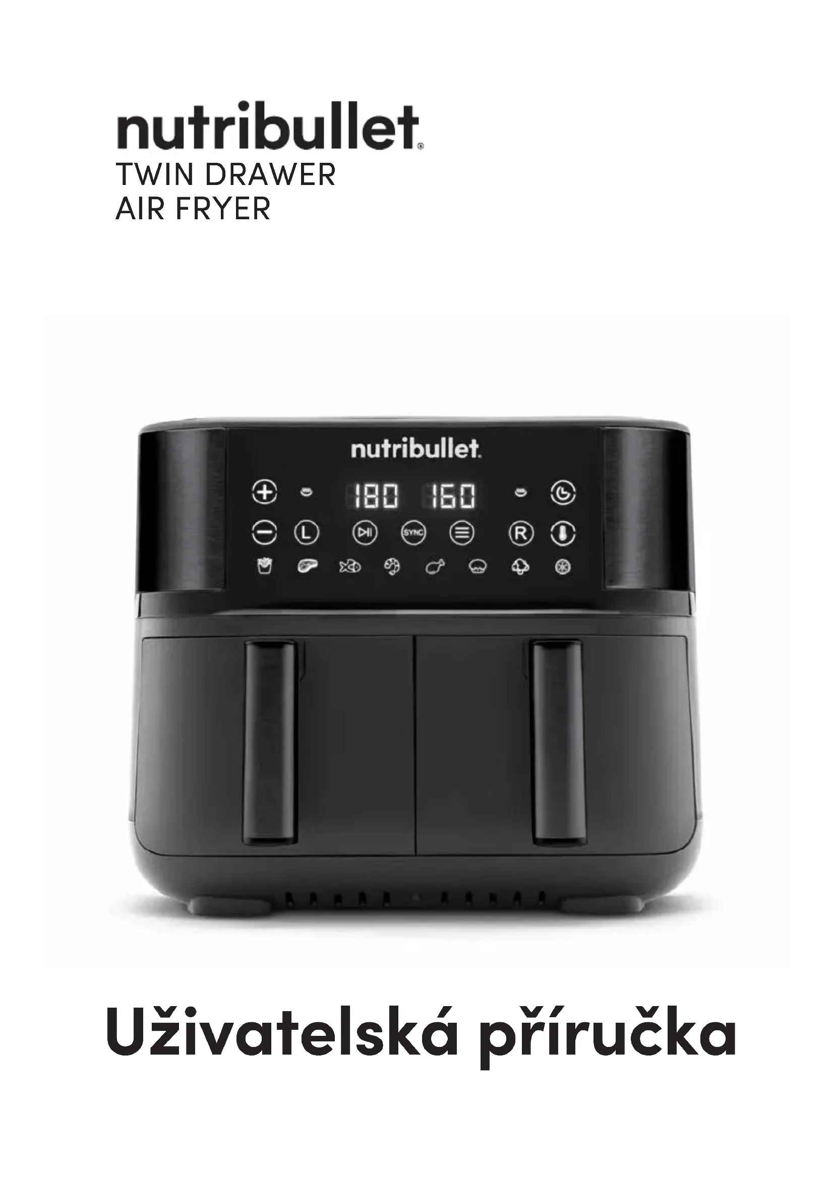 és a nutribullet logó a CapBran Holdings, LLC regisztrált védjegye az Egyesült Államokban és a világon. Az illusztrációk eltérhetnek a tényleges terméktől. Folyamatosan fejlesztjük termékeinket, ezért az itt közölt specifikációk előzetes értesítés nélkül változhatnak. 240426_NBA93200 (NBA-200A)Uživatelská příručka TWIN DRAWER AIR FRYER• Pokud spotřebič nepoužíváte a před čištěním ho vytáhněte ze zásuvky. Před montáží nebo demontáží dílů a před čištěním spotřebiče nechte mixér vychladnout. • Běžně zkontrolujte váš spotřebič, zda není poškozený. Nepoužívejte tento ani žádný jiný spotřebič s poškozeným kabelem nebo zástrčkou nebo po poruše nebo jakémkoliv poškození spotřebiče. Vraťte ho do nejbližšího autorizovaného servisu k prohlédnutí, opravě nebo nastavení.• Pokud je přívodní kabel poškozen, musí jej vyměnit výrobce, jeho servisní zástupce nebo podobně kvalifikované osoby, aby se předešlo rizikům.• Spotřebič a kabel udržujte mimo dosah dětí.• Používání neoriginálního příslušenství nebo příslušenství nedoporučeného nebo neprodaného výrobcem může způsobit zranění nebo závady.• Pouze pro použití na kuchyňské lince. Ujistěte se, že je povrch rovný, čistý a suchý. Nepokládejte spotřebič během používání blízko okraje kuchyňské linky. Nikdy nepoužívejte zásuvku pod pultem, což může kabel zpřístupnit pro děti.• Nepoužívejte ve venkovním prostředí.• Nenechávejte kabel viset přes okraj stolu ani z kuchyňské linky či v blízkosti horkých povrchů. • Neumisťujte je do blízkosti horkých plynových nebo elektrických hořáků nebo vyhřívané trouby.• Velký pozor musíte dávat při přesunování spotřebiče obsahujícího horký olej nebo jiné horké kapaliny. Před manipulací nebo přesunováním nechejte vždy spotřebič vychladnout.• Před obsluhováním se ujistěte se, že je spotřebič čistý. Rozlité potraviny mohou vytvořit vážné popáleniny. Spotřebič a kabel udržujte mimo dosah dětí. Nepoužívejte s prodlužovacím kabelem. • Z důvodu ochrany před požárem, úrazem elektrickým proudem a zraněním osob neponořujte spotřebič nebo kabel ani zástrčku do vody nebo jiné tekutiny • Když spotřebič nepoužíváte, vytáhněte ho ze zásuvky a vypněte ho, když vkládáte varné zásuvky do základny nebo ji ze základny vyjímáte. • Nedotýkejte se horkých povrchů. Používejte držadla na fritovacích nádobách. Během horkovzdušného fritování se horká pára uvolňuje ventilačním otvory v zadní části fritézy. Udržujte vaše ruce a tvář mimo páru a mimo ventilační otvory. Dávejte pozor při vyjímání fritovacích nádob ze spotřebiče, protože tam může být horká pára.• Nepoužívejte tento spotřebič k jinému než určenému účelu. Při nesprávném použití může dojít ke zranění.• Vždy používejte izolované chňapky do trouby nebo pokud je dostupné, používejte držadla nebo knoflíky. PŘED OBSLUHOVÁNÍMSI PEČLIVĚ A DŮKLADNĚ PŘEČTĚTE VŠECHNY POKYNY. Důležité bezpečnostní pokyny Při obsluhování vaší vzduchové fritézy se dvěma zásuvkami nutribullet pamatujte: v první řadě na bezpečnost.Pozor! Abyste předešli riziku vážného zranění, pečlivě si před použitím spotřebiče nutribullet přečtěte všechny pokyny. Při používání jakéhokoliv elektrického spotřebiče je třeba vždy dodržovat základní bezpečnostní opatření, včetně následujících důležitých informací. Tyto pokyny si uložte! POUZE PRO POUŽITÍ V DOMÁCNOSTI