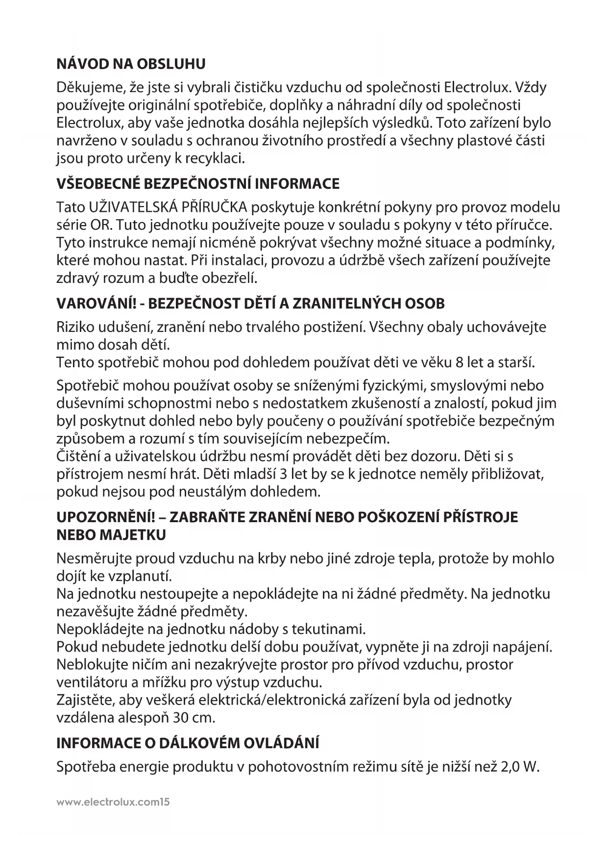 Tato UŽIVATELSKÁ PŘÍRUČKA poskytuje konkrétní pokyny pro provoz modelu série OR. Tuto jednotku používejte pouze v souladu s pokyny v této příručce. Tyto instrukce nemají nicméně pokrývat všechny možné situace a podmínky, které mohou nastat. Při instalaci, provozu a údržbě všech zařízení používejte zdravý rozum a buďte obezřelí. VAROVÁNÍ! - BEZPEČNOST DĚTÍ A ZRANITELNÝCH OSOB Riziko udušení, zranění nebo trvalého postižení. Všechny obaly uchovávejte mimo dosah dětí. Tento spotřebič mohou pod dohledem používat děti ve věku 8 let a starší. Spotřebič mohou používat osoby se sníženými fyzickými, smyslovými nebo duševními schopnostmi nebo s nedostatkem zkušeností a znalostí, pokud jim byl poskytnut dohled nebo byly poučeny o používání spotřebiče bezpečným způsobem a rozumí s tím souvisejícím nebezpečím. Čištění a uživatelskou údržbu nesmí provádět děti bez dozoru. Děti si s přístrojem nesmí hrát. Děti mladší 3 let by se k jednotce neměly přibližovat, pokud nejsou pod neustálým dohledem. UPOZORNĚNÍ! – ZABRAŇTE ZRANĚNÍ NEBO POŠKOZENÍ PŘÍSTROJE NEBO MAJETKU Nesměrujte proud vzduchu na krby nebo jiné zdroje tepla, protože by mohlo dojít ke vzplanutí. Na jednotku nestoupejte a nepokládejte na ni žádné předměty. Na jednotku nezavěšujte žádné předměty. Nepokládejte na jednotku nádoby s tekutinami. Pokud nebudete jednotku delší dobu používat, vypněte ji na zdroji napájení. Neblokujte ničím ani nezakrývejte prostor pro přívod vzduchu, prostor ventilátoru a mřížku pro výstup vzduchu. Zajistěte, aby veškerá elektrická/elektronická zařízení byla od jednotky vzdálena alespoň 30 cm. INFORMACE O DÁLKOVÉM OVLÁDÁNÍ Spotřeba energie produktu v pohotovostním režimu sítě je nižší než 2,0 W.www.electrolux.com16 Informace k elektroinstalaci VAROVÁNÍ! Vyhněte se nebezpečí požáru nebo úrazu elektrickým proudem. Tuto jednotku lze používat při napájení 50 Hz nebo 60 Hz bez jakékoli změny. Nepoužívejte prodlužovací kabel ani adaptérovou zástrčku. Z napájecího kabelu nevyjímejte žádný kontakt. Dbejte o to, abyste napájecí kabel nepřiskřípli, neohýbali ani nezauzlovali. Dbejte o to, abyste napájecí kabel nepřerušili nebo nepoškodili. Pokud je dodaný napájecí kabel přestřižen nebo poškozen, smí jej vyměnit pouze společnost Electrolux, její servisní zástupce nebo osoby s podobnou kvalifikací. Tento přístroj neobsahuje žádné díly, které by mohl opravovat uživatel. K opravě vždy volejte autorizovaný servis společnosti Electrolux. Pokud si nejste jisti, že je zásuvka dostatečně uzemněna nebo chráněna pojistkou s časovým zpožděním nebo jističem, nechte nainstalovat správnou zásuvku podle Národního elektrického kodexu NEBO platných místních předpisů a nařízení elektrikářem s náležitou kvalifikací. V blízkosti tohoto ani jiného spotřebiče neskladujte ani nepoužívejte benzín nebo jiné hořlavé plyny a kapaliny. Přečtěte si štítky výrobků, kde je uvedeno, zda nejsou hořlavé i další upozornění. Abyste zabránili úrazu elektrickým proudem a/nebo nebezpečí požáru, nenechte do přístroje vniknout vodu ani jinou kapalinu nebo hořlavý čisticí prostředek. Před čištěním nezapomeňte přístroj odpojit ze zásuvky. Nikdy neodpojujte přístroj od sítě zatažením za napájecí kabel. Vždy pevně uchopte zástrčku a vytáhněte ji přímo ze zásuvky. Bezpečnostní Opatření Nevkládejte prsty ani žádné předměty do prostoru pro odvod vzduchu nebo do přední mřížky přístroje. Nespouštějte ani nezastavujte jednotku odpojením napájecího kabelu nebo vypnutím napájení na rozvodné skříňce. Případě poruchy (jiskry, zápach spáleniny atd.) okamžitě zastavte provoz, odpojte napájecí kabel a zavolejte autorizovaný servis společnosti Electrolux. Přístroj nepoužívejte, pokud máte mokré ruce. Netahejte za napájecí kabel. Nedotýkejte se lopatek ventilátoru při vyjímání filtru (filtrů). Nenaklánějte produkt o více než 10°, ani produkt nepřenášejte, když je voda v přihrádce nádrže/filtru, protože může začít vytékat ven. Mějte na paměti, že vysoké úrovně vlhkosti mohou podpořit růst biologických organismů v okolí. Zabraňte tomu, aby okolí zvlhčovače bylo vlhké nebo mokré. Pokud se objeví vlhkost, snižte výstupní hodnotu zvlhčovače. Pokud nelze výstupní hodnotu zvlhčovače snížit, používejte zvlhčovač přerušovaně. Zabraňte tomu, aby materiály, absorbující vlhkost, jako jsou koberce, záclony, závěsy nebo ubrusy, zvlhly. Při plnění a čistění spotřebiče jej vypněte. Nikdy nenechávejte vodu v nádržce, pokud spotřebič nepoužíváte. Před uskladněním spotřebič vyprázdněte a vyčistěte. Před dalším použitím spotřebič vyčistěte. 0~10° >10°