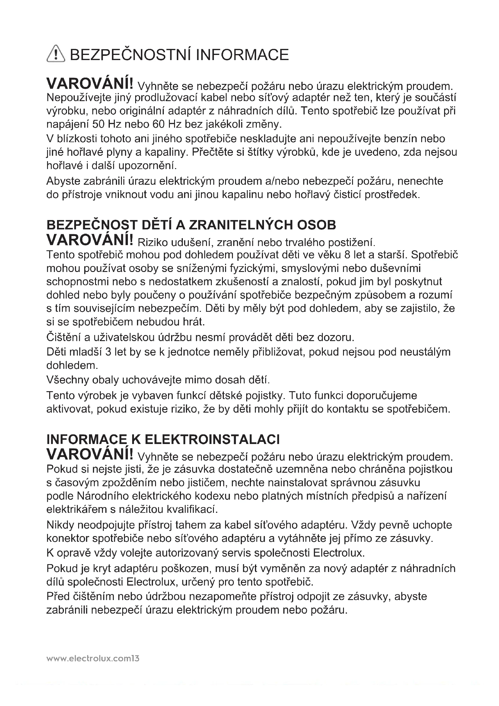 VAROVÁNÍ! Vyhněte se nebezpečí požáru nebo úrazu elektrickým proudem. Pokud si nejste jisti, že je zásuvka dostatečně uzemněna nebo chráněna pojistkou s časovým zpožděním nebo jističem, nechte nainstalovat správnou zásuvku podle Národního elektrického kodexu nebo platných místních předpisů a nařízení elektrikářem s náležitou kvalikací. Nikdy neodpojujte přístroj tahem za kabel síťového adaptéru. Vždy pevně uchopte konektor spotřebiče nebo síťového adaptéru a vytáhněte jej přímo ze zásuvky. K opravě vždy volejte autorizovaný servis společnosti Electrolux. Pokud je kryt adaptéru poškozen, musí být vyměněn za nový adaptér z náhradních dílů společnosti Electrolux, určený pro tento spotřebič. Před čištěním nebo údržbou nezapomeňte přístroj odpojit ze zásuvky, abyste zabránili nebezpečí úrazu elektrickým proudem nebo požáru.www.electrolux.com14