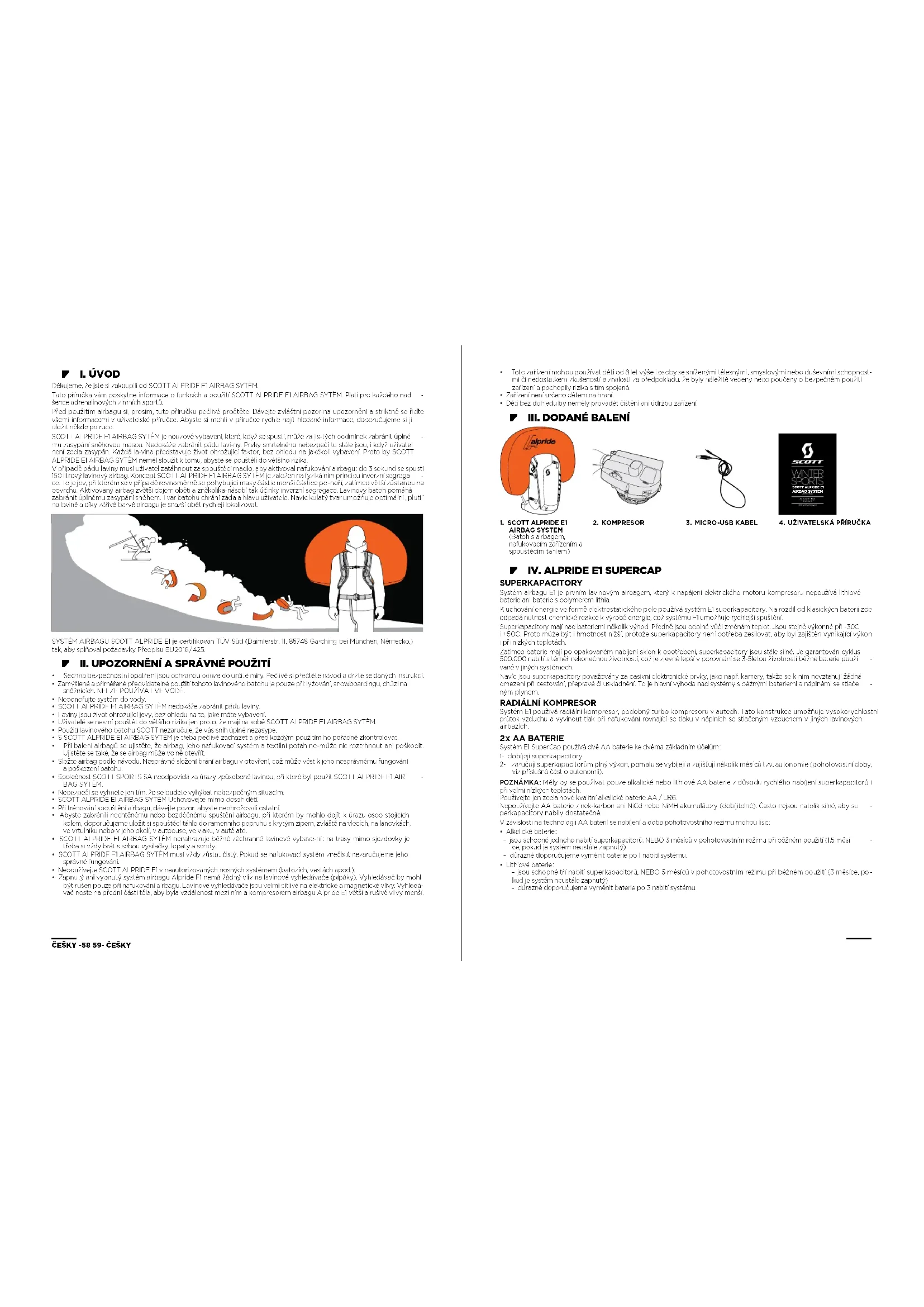 - I. ÚVOD Děkujeme, že jste si zakoupili od SCOTT ALPRIDE E1 AIRBAG SYTÈM. Tato příručka vám poskytne informace o funkcích a použití SCOTT ALPRIDE E1 AIRBAG SYTÈM. Platí pro každého nad