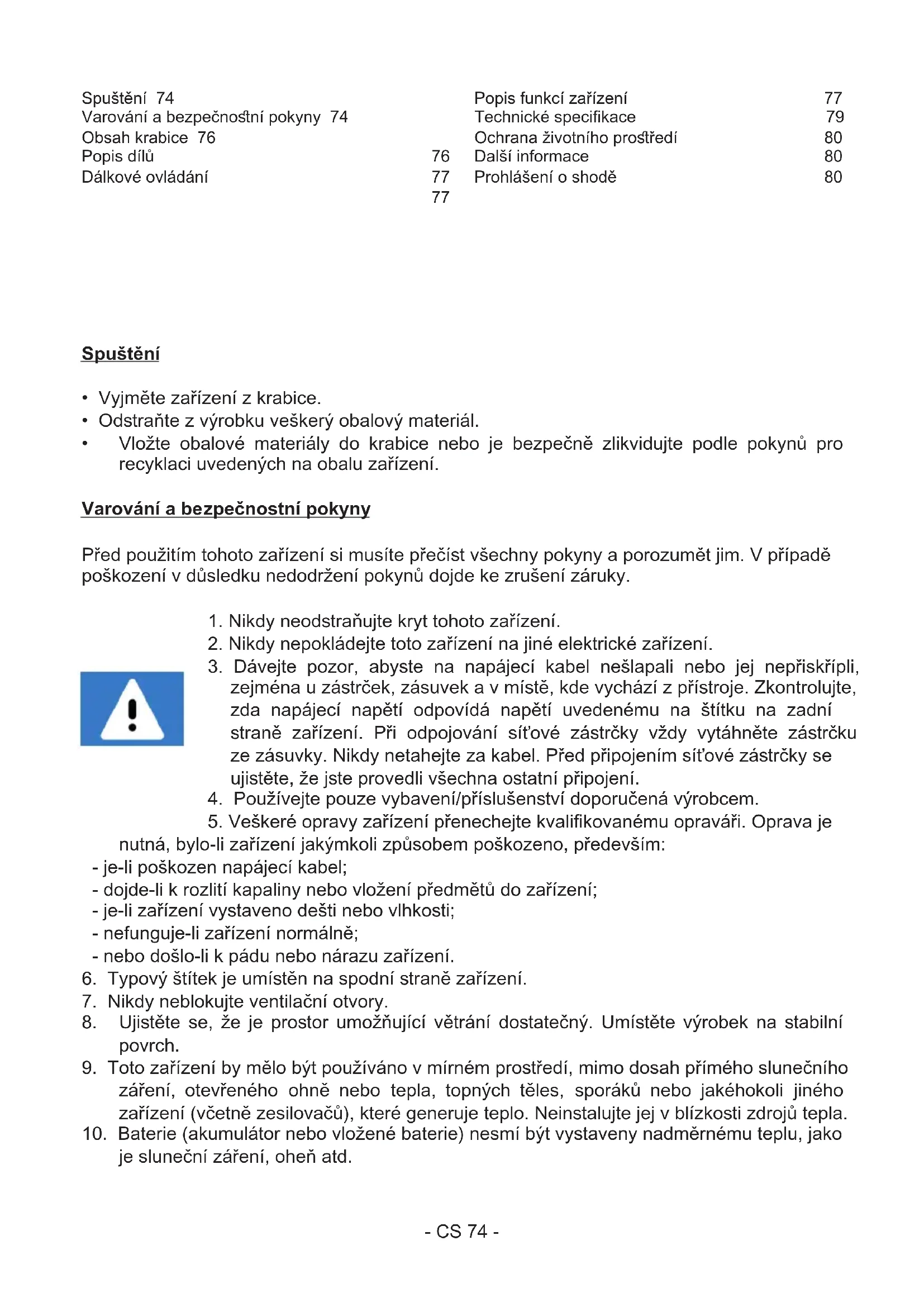 je sluneční záření, oheň atd. Spuštění 74 Varování a bezpečnoní pokyny 74 Obsah krabice 76 Popis dílů 76 Dálkové ovládání 77
