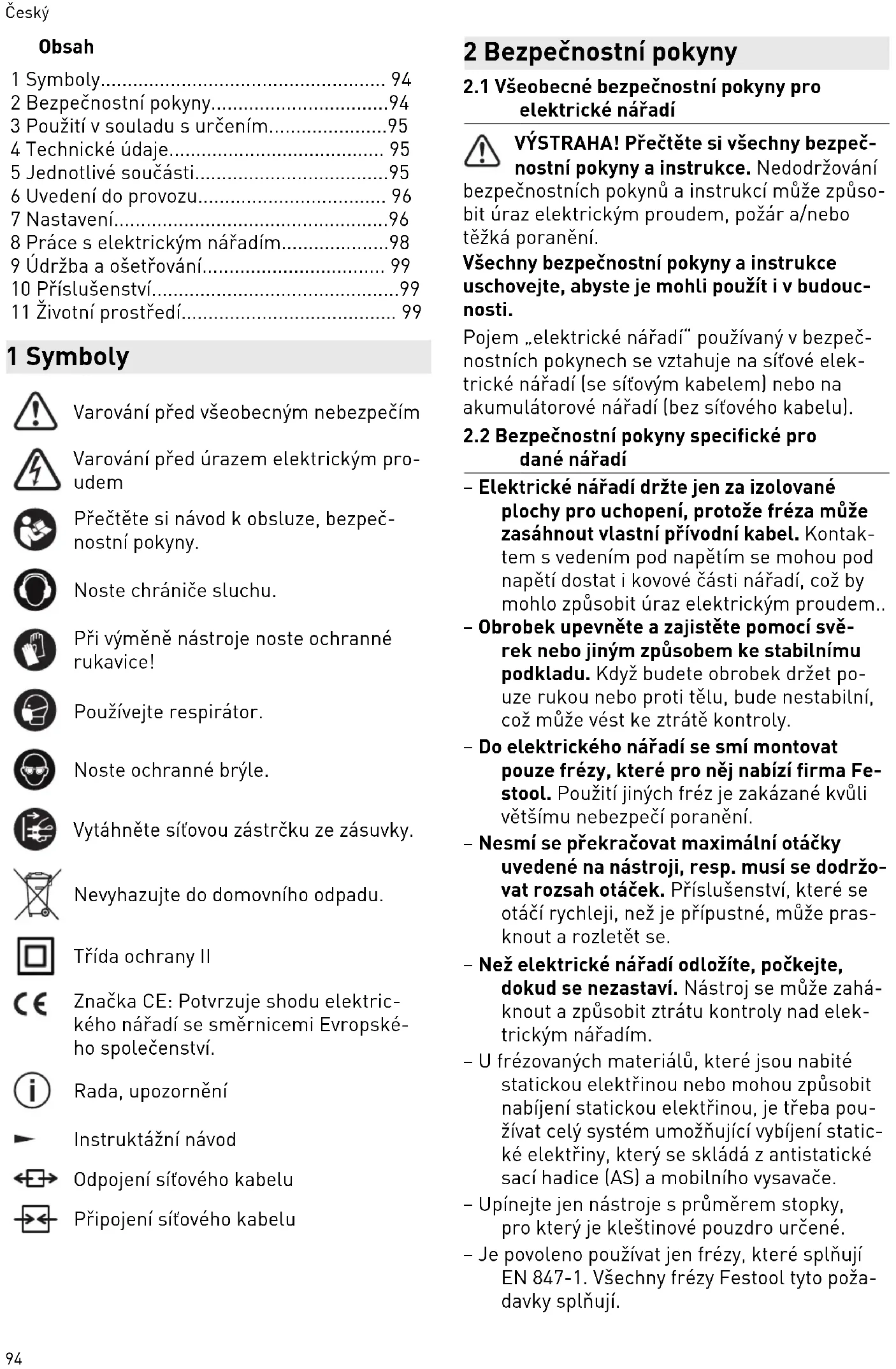 dané nářadí – Elektrické nářadí držte jen za izolované plochy pro uchopení, protože fréza může zasáhnout vlastní přívodní kabel. Kontak tem s vedením pod napětím se mohou pod napětí dostat i kovové části nářadí, což by mohlo způsobit úraz elektrickým proudem.. – Obrobek upevněte a zajistěte pomocí svě rek nebo jiným způsobem ke stabilnímu podkladu. Když budete obrobek držet po uze rukou nebo proti tělu, bude nestabilní, což může vést ke ztrátě kontroly. – Do elektrického nářadí se smí montovat pouze frézy, které pro něj nabízí firma Fe stool. Použití jiných fréz je zakázané kvůli většímu nebezpečí poranění. – Nesmí se překračovat maximální otáčky uvedené na nástroji, resp. musí se dodržo vat rozsah otáček. Příslušenství, které se otáčí rychleji, než je přípustné, může pras knout a rozletět se. – Než elektrické nářadí odložíte, počkejte, dokud se nezastaví. Nástroj se může zahá knout a způsobit ztrátu kontroly nad elek trickým nářadím. – U frézovaných materiálů, které jsou nabité statickou elektřinou nebo mohou způsobit nabíjení statickou elektřinou, je třeba pou žívat celý systém umožňující vybíjení static ké elektřiny, který se skládá z antistatické sací hadice (AS) a mobilního vysavače. – Upínejte jen nástroje s průměrem stopky, pro který je kleštinové pouzdro určené. – Je povoleno používat jen frézy, které splňují EN 847-1. Všechny frézy Festool tyto poža davky splňují. Český 94– Dbejte na řádné upevnění frézy a zkontro lujte bezchybný chod. – Kleštinové pouzdro a přesuvná matice ne smí být poškozené. – Frézy s prasklinami a frézy se změněným tvarem se nesmí používat.