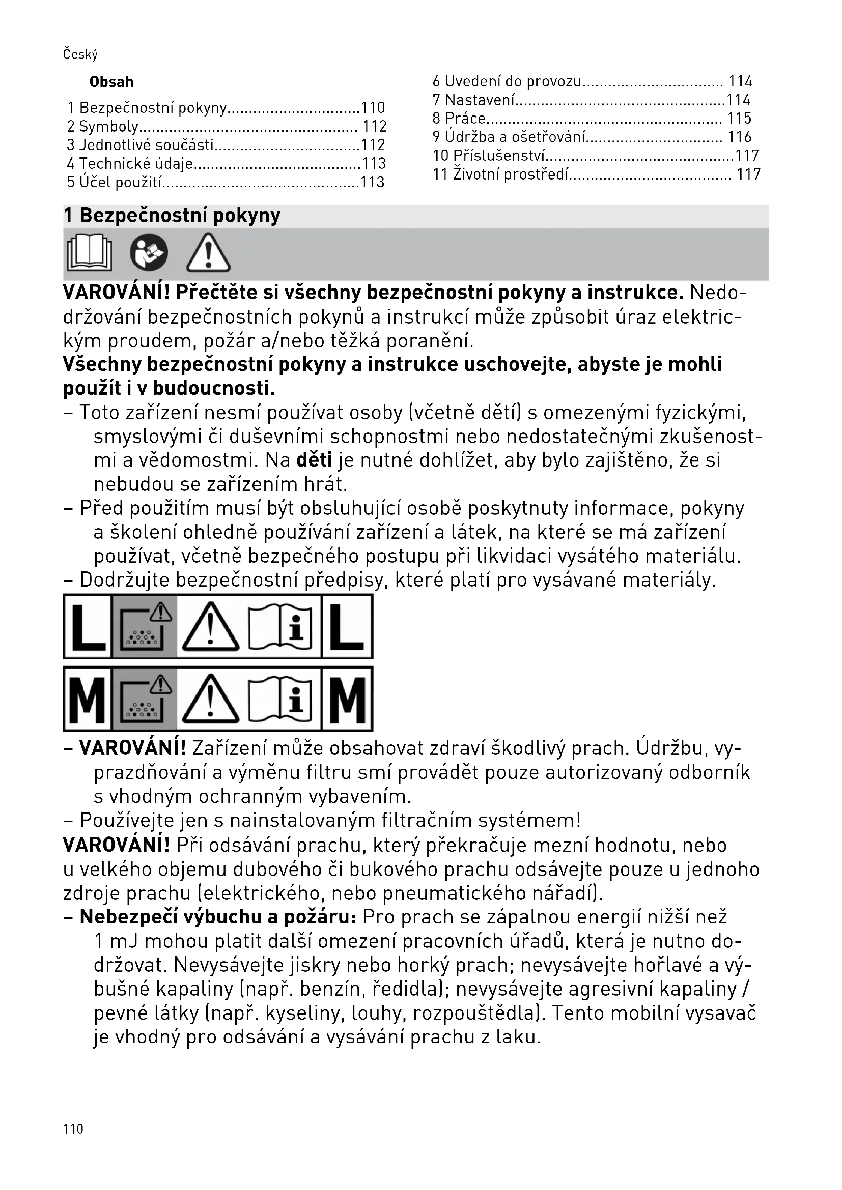 - 11 Životní prostředí 1 Bezpečnostní pokyny VAROVÁNÍ! Přečtěte si všechny bezpečnostní pokyny ainstrukce. Nedo držování bezpečnostních pokynů ainstrukcí může způsobit úraz elektric kým proudem, požár a/nebo těžká poranění. Všechny bezpečnostní pokyny ainstrukce uschovejte, abyste je mohli použít ivbudoucnosti. – Toto zařízení nesmí používat osoby (včetně dětí) somezenými fyzickými, smyslovými či duševními schopnostmi nebo nedostatečnými zkušenost mi avědomostmi. Na děti je nutné dohlížet, aby bylo zajištěno, že si nebudou se zařízením hrát. – Před použitím musí být obsluhující osobě poskytnuty informace, pokyny aškolení ohledně používání zařízení alátek, na které se má zařízení používat, včetně bezpečného postupu při likvidaci vysátého materiálu. – Dodržujte bezpečnostní předpisy, které platí pro vysávané materiály. – VAROVÁNÍ! Zařízení může obsahovat zdraví škodlivý prach. Údržbu, vy prazdňování avýměnu filtru smí provádět pouze autorizovaný odborník svhodným ochranným vybavením. – Používejte jen snainstalovaným filtračním systémem! VAROVÁNÍ! Při odsávání prachu, který překračuje mezní hodnotu, nebo uvelkého objemu dubového či bukového prachu odsávejte pouze ujednoho zdroje prachu (elektrického, nebo pneumatického nářadí). – Nebezpečí výbuchu apožáru: Pro prach se zápalnou energií nižší než 1mJ mohou platit další omezení pracovních úřadů, která je nutno do držovat. Nevysávejte jiskry nebo horký prach; nevysávejte hořlavé avý bušné kapaliny (např. benzín, ředidla); nevysávejte agresivní kapaliny/ pevné látky (např. kyseliny, louhy, rozpouštědla). Tento mobilní vysavač je vhodný pro odsávání avysávání prachu zlaku. Český 110– Dbejte na to, aby nedošlo kpoškození přívodního kabelu (např. přejetím, taháním za něj). Chraňte ho před horkem, olejem aostrými hranami. Zástrčku nevytahujte ze síťové zásuvky za kabel. – Pravidelně kontrolujte síťovou zástrčku ikabel avpřípadě poškození je nechte vyměnit vautorizovaném servisu. Vpřípadě výměny přívodního kabelu je nutno použít pouze typ uvedený vseznamu náhradních dílů. – Zařízení chraňte před deštěm. – Zbezpečnostních důvodů připojujte zařízení pouze do zásuvek sochran ným uzemněním. – Zásuvku na zařízení používejte pouze kúčelu uvedenému vnávodu. – Používejte jen originální příslušenství Festool. – Když mobilní vysavač nepoužíváte, nebo před prováděním údržby ači štění vytáhněte zástrčku ze zásuvky. p. 117